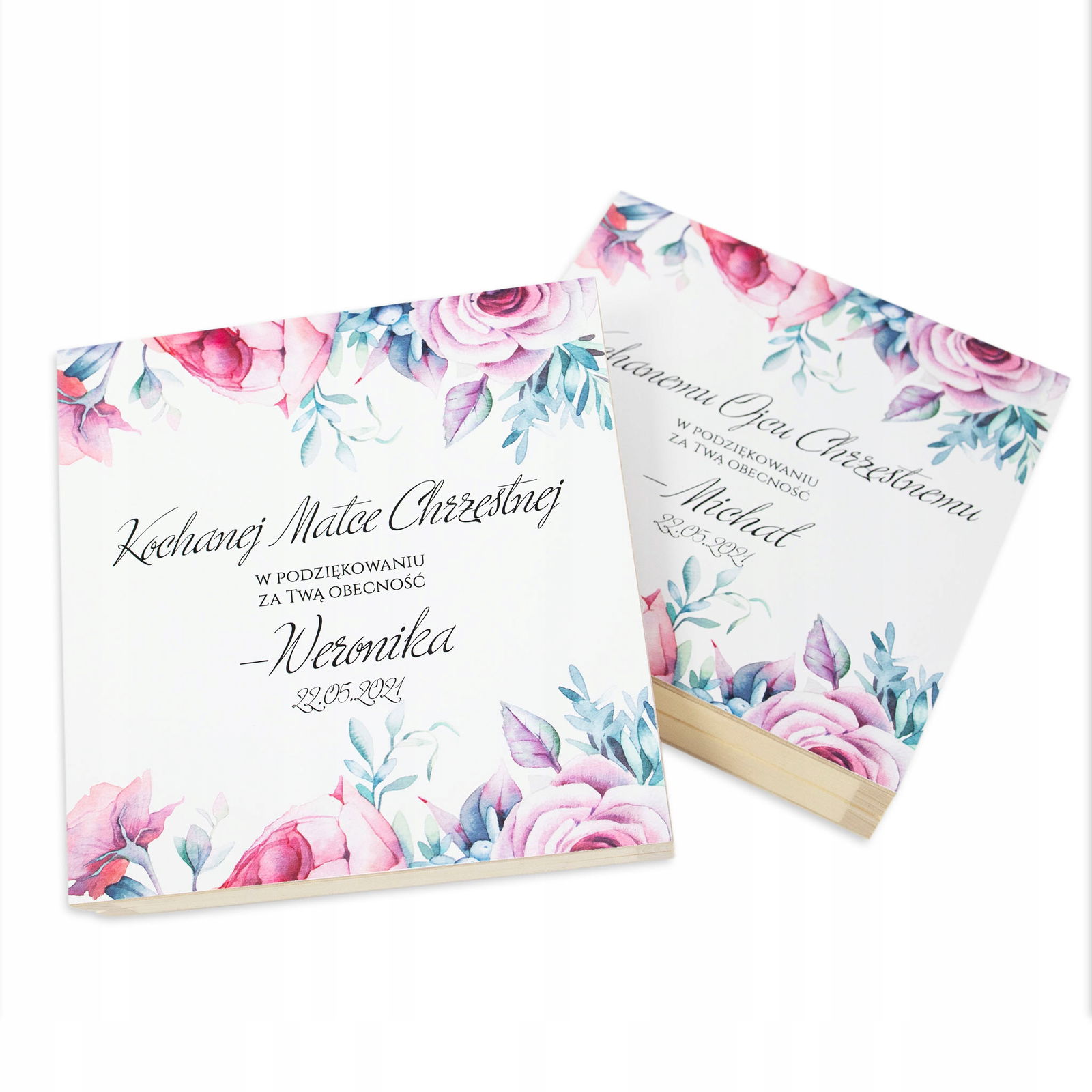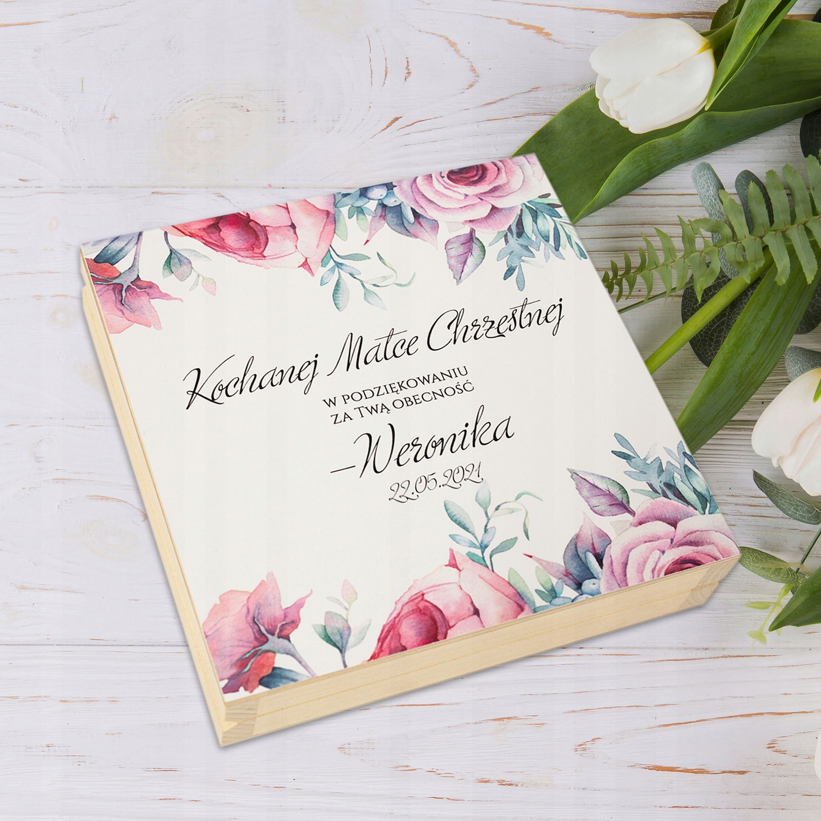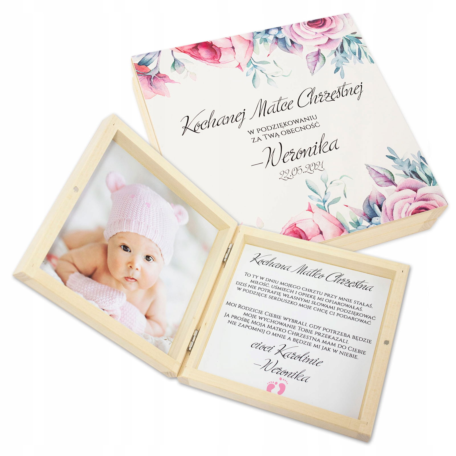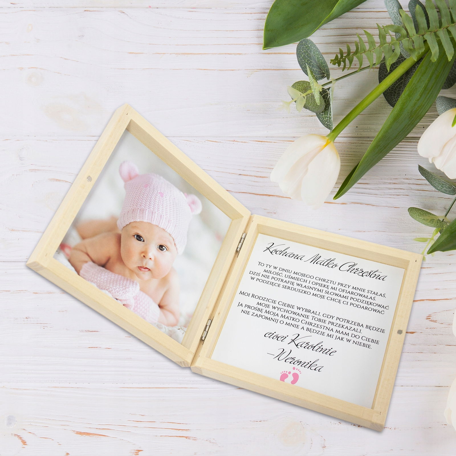 Wyjątkowo eleganckie podziękowania dla Matki Chrzestnej lub Ojca Chrzestnego ze zdjęciem Waszego dziecka z pewnością wzruszy ich do łez. Pięknie przygotowane w drewnianej skrzyneczce będzie dla nich trwałą pamiątką na długie lata.