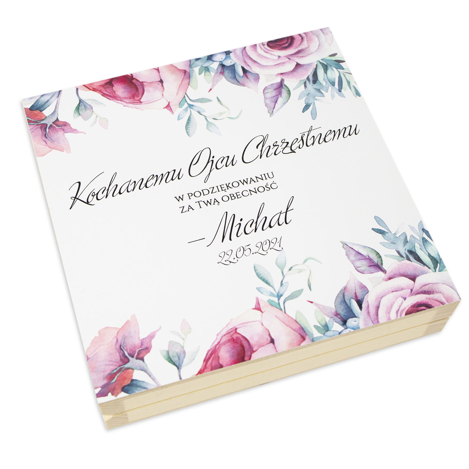 Wyjątkowo eleganckie podziękowania dla Matki Chrzestnej lub Ojca Chrzestnego ze zdjęciem Waszego dziecka z pewnością wzruszy ich do łez. Pięknie przygotowane w drewnianej skrzyneczce będzie dla nich trwałą pamiątką na długie lata.