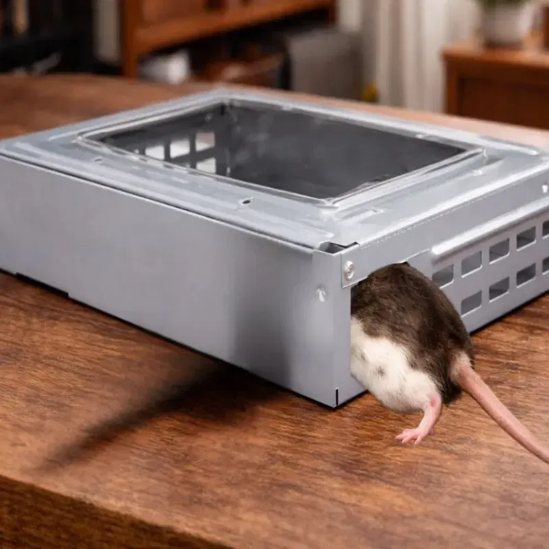 Pułapka została zaprojektowana tak, aby nie powodować obrażeń ani cierpienia zwierzęcia. Mysz zostaje bezpiecznie zatrzymana w środku bez użycia trucizn, sprężyn czy elementów powodujących urazy.