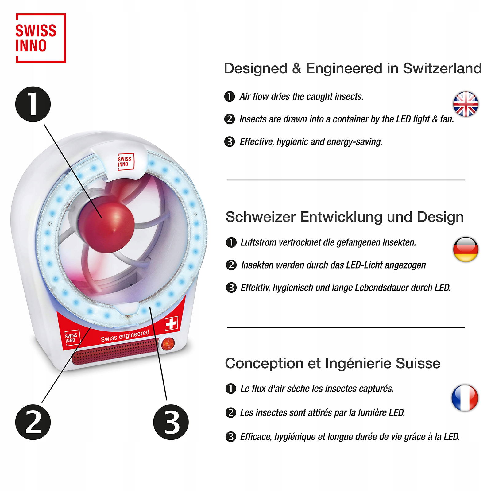 Nowoczesna wentylacja UV 15 W marki SWISSINNO zapewnia większą moc dzięki diodom LED i dużej wydajności. Dzięki najnowszej technologii LED, urządzenie działa skutecznie na powierzchni do 80 m². Dodatkowo, ultra energooszczędne światło i klimatyzacja przyciągają owady, które następnie są łatwo zbierane w pojemniku zbiorczym.