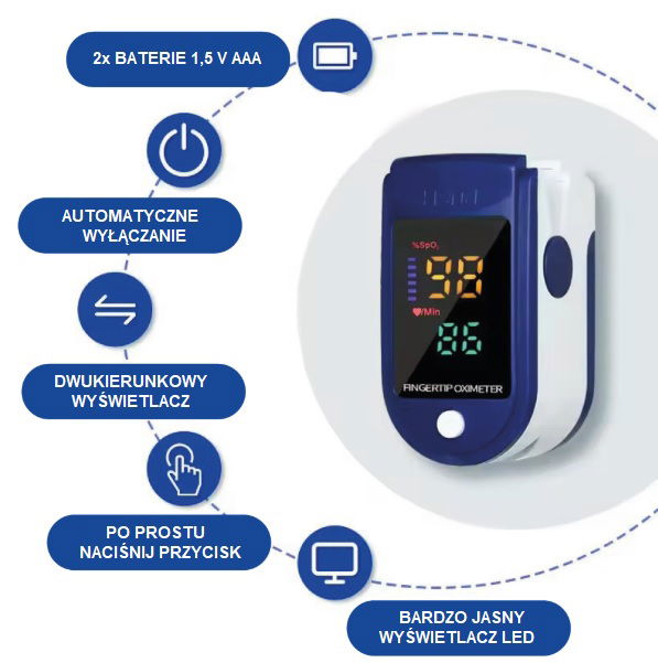 Pulsoksymetr 3w1 umożliwia dokonanie szybkiego, łatwego i bezinwazyjnego pomiaru zarówno pulsu, poziomu tlenu we krwi, jak i perfuzji (przepływu krwi w organizmie). Mały i przenośny pulsoksymetr zaprojektowany jest tak, aby można go było łatwo zabrać wszędzie. Urządzenie działa w trybie bezinwazyjnym, a jego użytkowanie nie wymaga specjalnych umiejętności. Pomiar pulsu oraz poziomu tlenu we krwi trwa zaledwie kilka sekund, co pozwala na szybką reakcję. Wystarczy umieścić palec w urządzeniu, aby uzyskać pomiar.