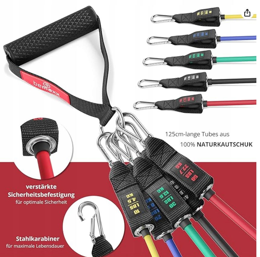 - ? Bezpieczeństwo zawsze trenuje z Tobą - dzięki czemu możesz skupić się na swoich treningach ze spokojem, taśmy treningowe są wykonane w 100% z dwuwarstwowego naturalnego lateksu i są dzięki temu szczególnie odporne na rozdarcia. Ponadto okucia są wyjątkowo mocno zszyte, co zapobiega rozdarciom oczek. Karabińczyki są również wyjątkowo mocne i nie wyginają się.