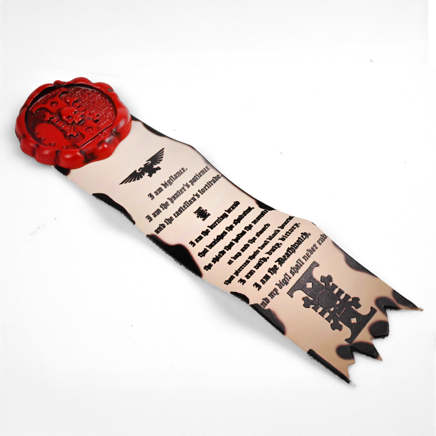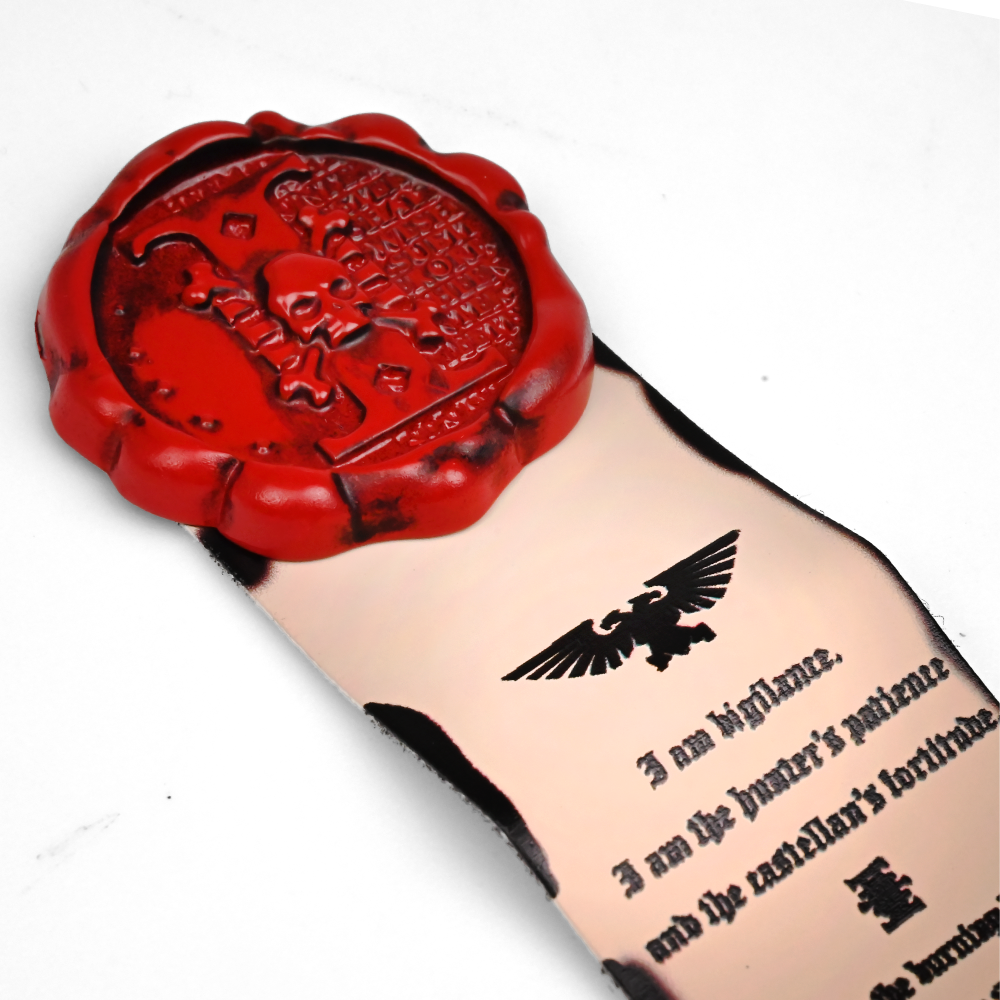 Z mrocznej otchłani 41. milenium wyłania się Pieczęć Czystości Deathwatch – kultowy artefakt i wyjątkowa przypinka kolekcjonerska z uniwersum Warhammer 40k. Ten element wyposażenia Deathwachersów jest esencją czystości, bezlitosnej wiary i wiecznego czuwania, doskonale oddając klimat najbardziej bezlitosnych obrońców Imperatora. O długości 8 cm, wykonana z trwałej metalowej żywicy, przypinka łączy solidność z misteryjnie zdobionym wyglądem. Górną część wieńczy intensywnie czerwona rozeta w stylu wosku pieczętnego z wytłoczonym czaszkowym symbolem, a poniżej rozciąga się stylizowany pergamin z nadpalonymi brzegami i tekstem świętej przysięgi w gotyckim kroju pisma. Widniejący na nim dwugłowy orzeł oraz litera „I” – znak Inkwizycji – dodają całości sakralnego charakteru. Z tyłu znajdują się dwa solidne zapięcia typu motylek. Ta Pieczęć Czystości collectible to nie tylko Warhammer 40k merchandise – to pamiątka, symbol i wyraz oddania wobec Imperium. Idealna do ekspozycji lub jako element cosplayu, przypinka ta przemawia do serc lojalnych fanów i kolekcjonerów, którzy wiedzą, że czystość i lojalność są bronią.