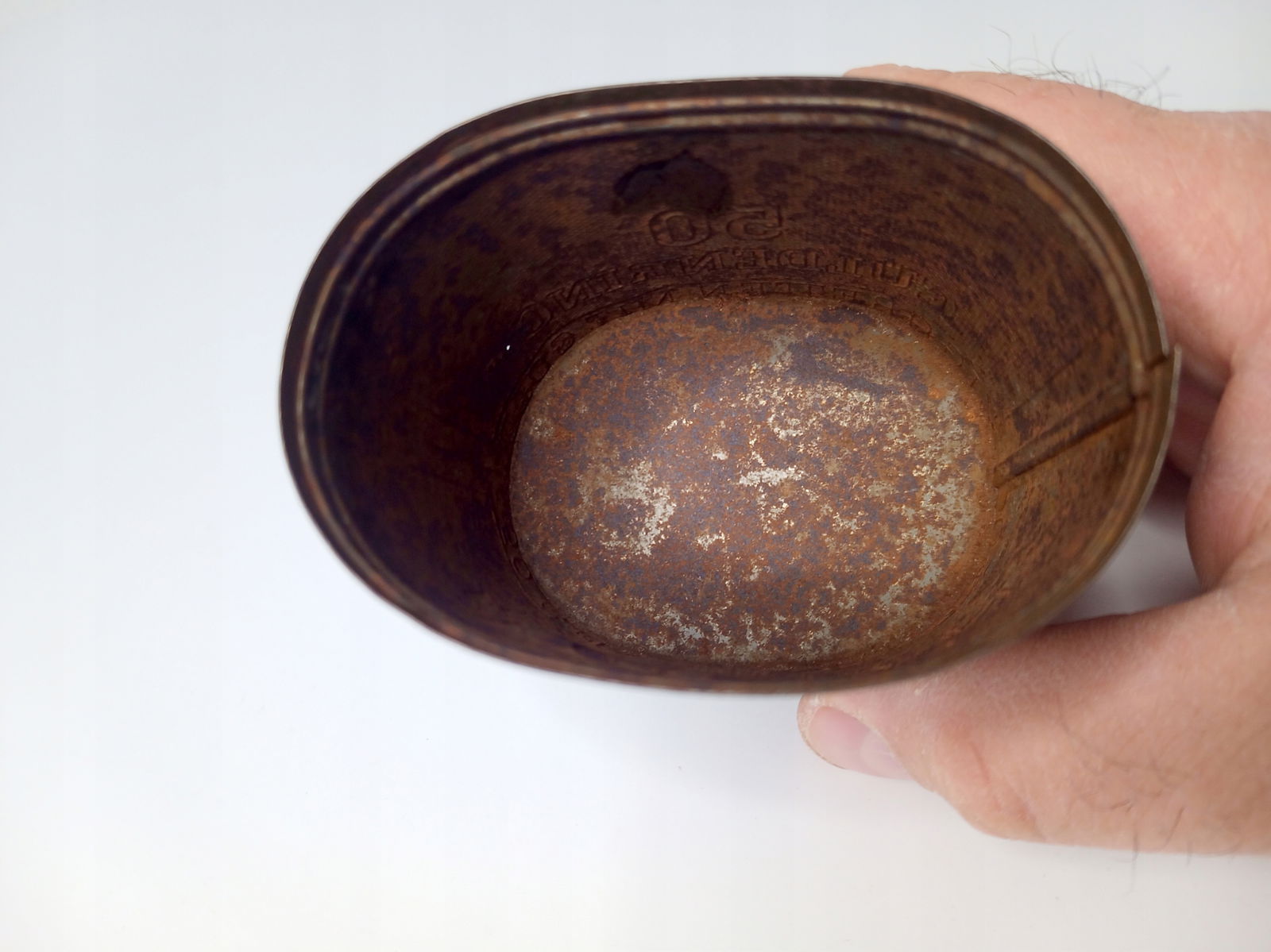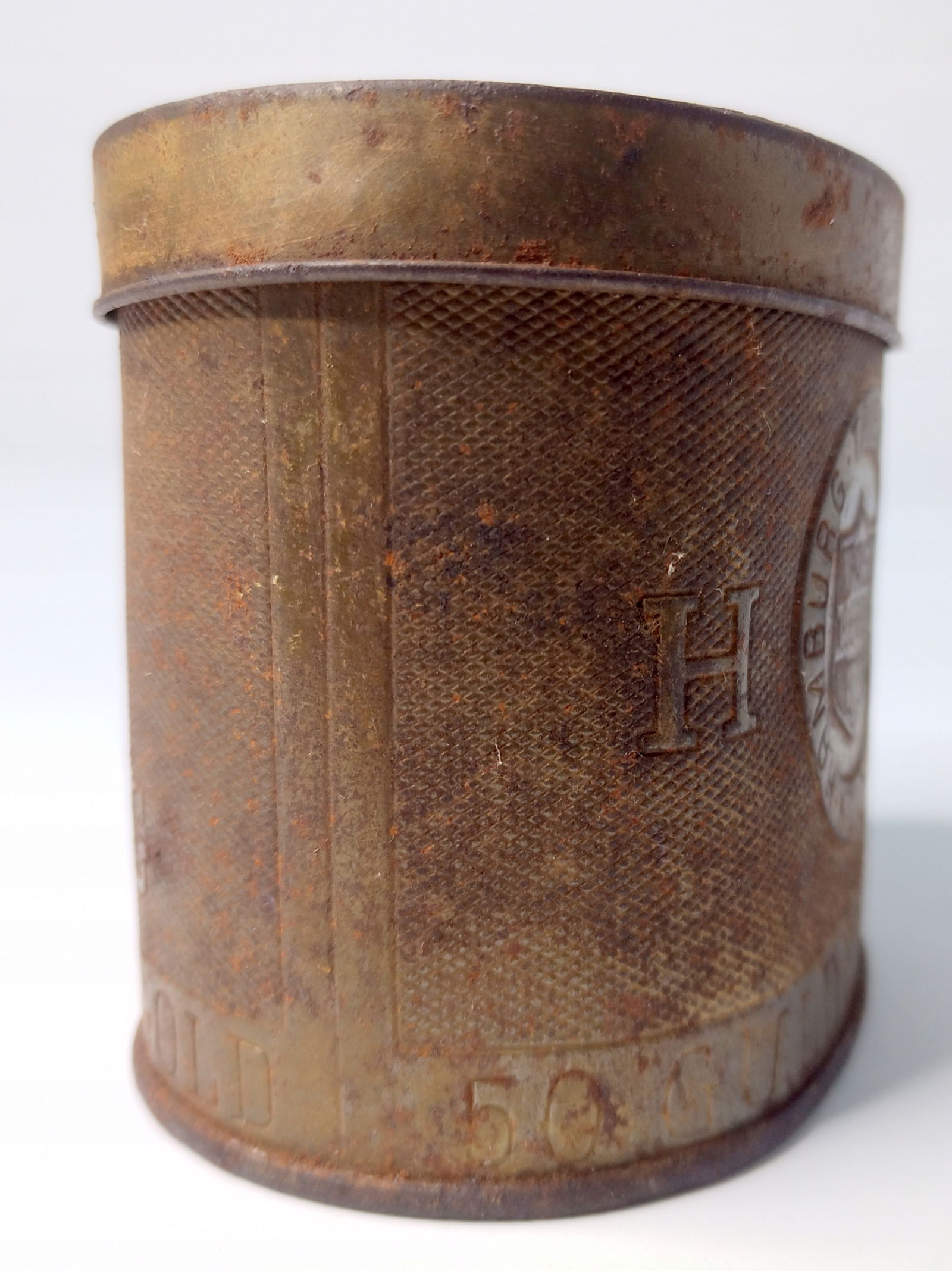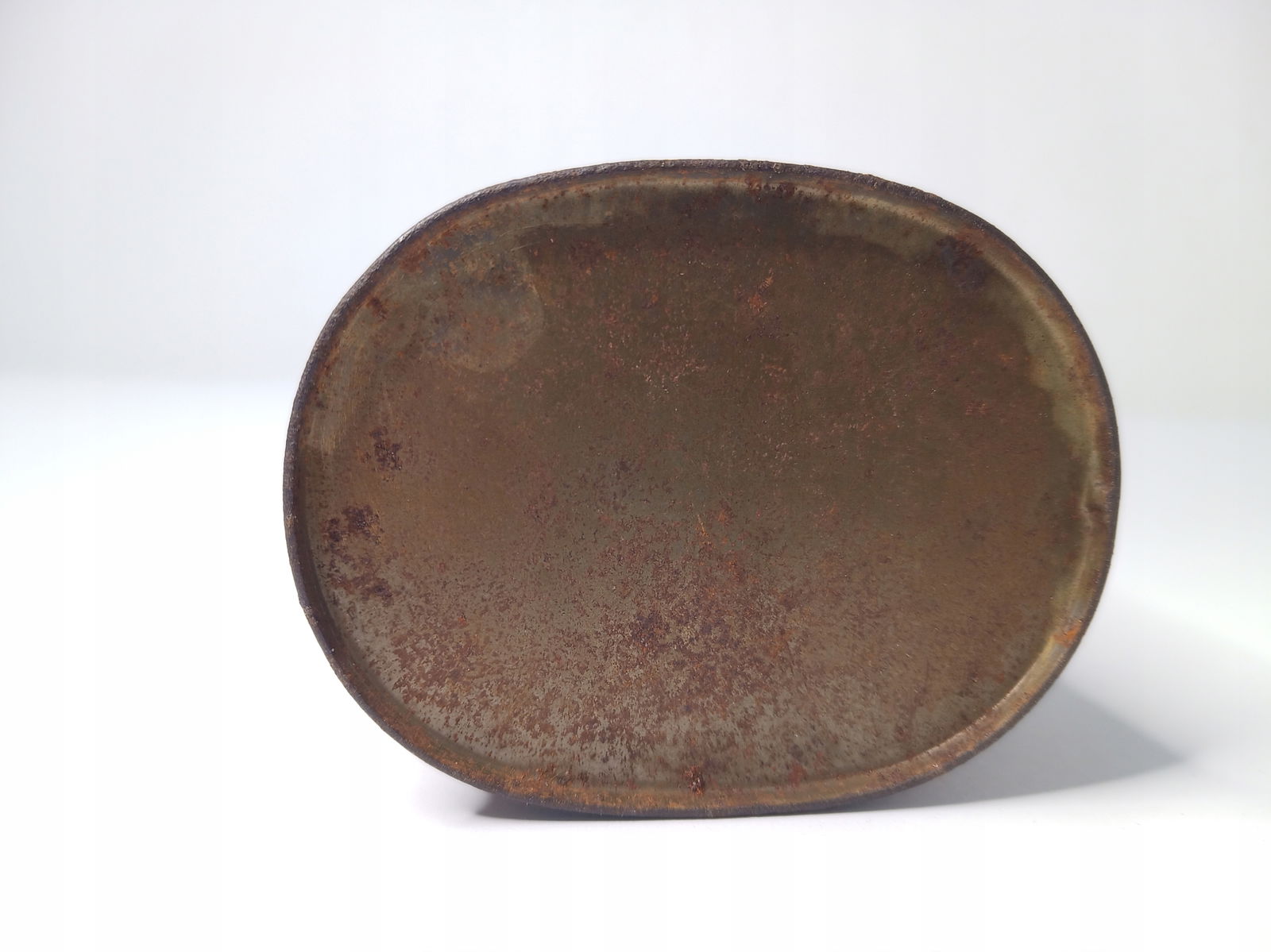 Przedmiot posiada wyraźną korozję oraz zagięcia. Puszka posiada ledwo widoczną dziurkę.Pokrywka ma dziurkę, która już łatwo rzuca się w oczy. Wszystko można zobaczyć na zdjęciach.