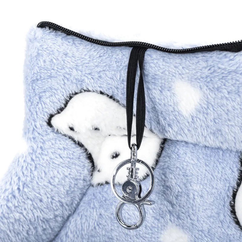 Puszysta, wygodna i ciepła. Duży otwór widokowy, łatwa interakcja między człowiekiem a zwierzęciem. Dołączona klamra zapobiegająca zerwaniu linki.