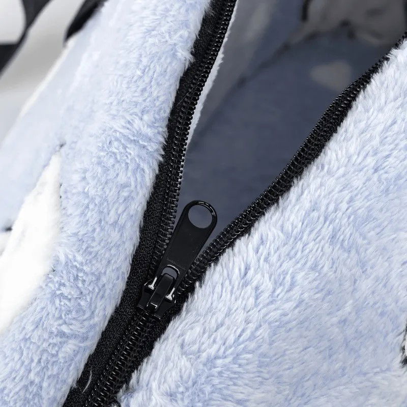 Puszysta, wygodna i ciepła. Duży otwór widokowy, łatwa interakcja między człowiekiem a zwierzęciem. Dołączona klamra zapobiegająca zerwaniu linki.