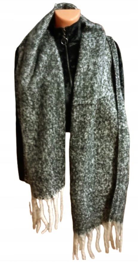 PUSZYSTY SZALIK SZAL GRUBY Z FRĘDZLAMI MIĘKKI CIEPŁY SZARO CZARNY DUŻY