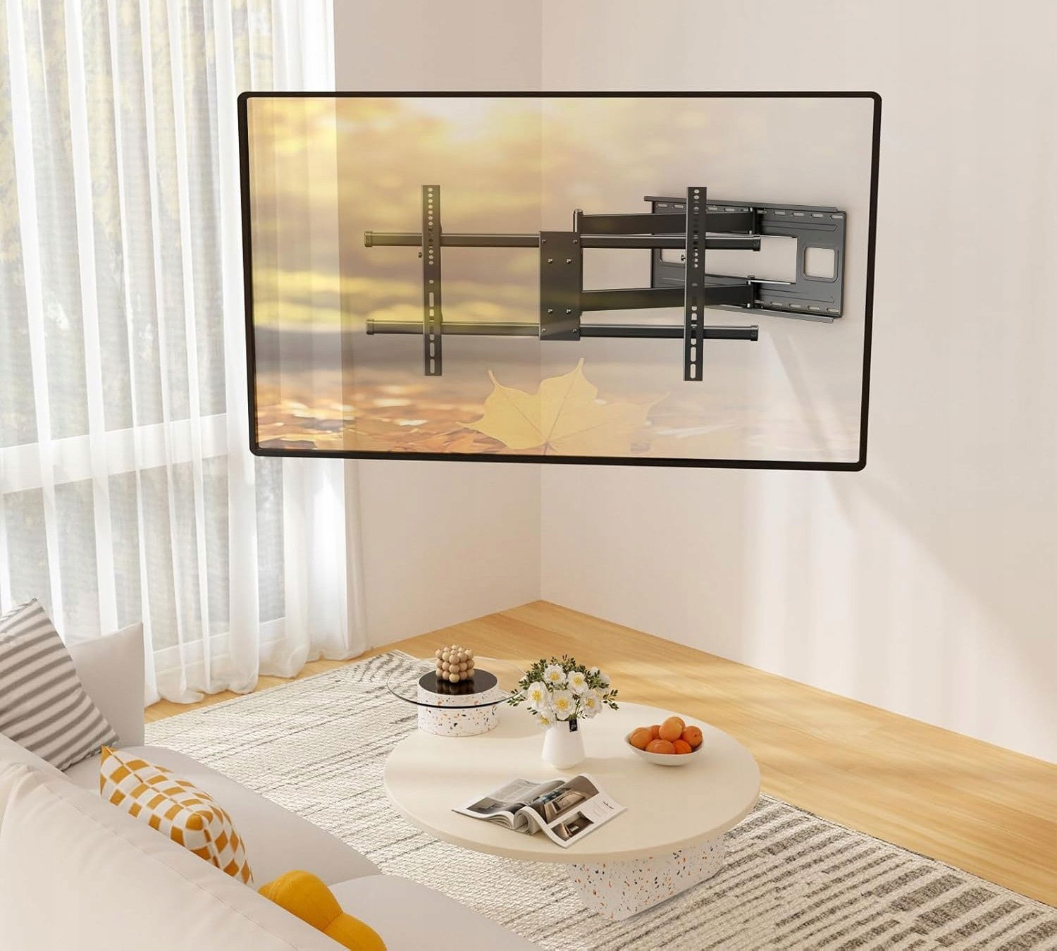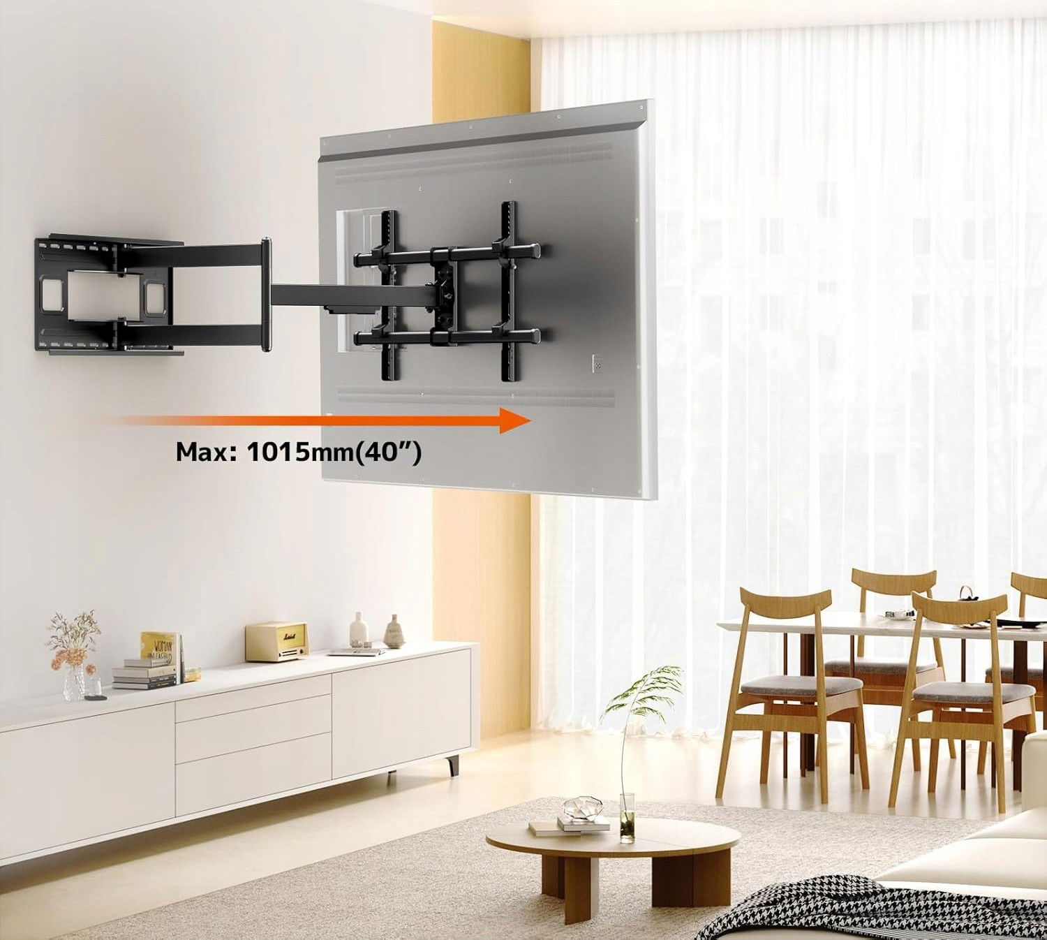 Uchwyt ścienny PUTORSEN z długim ramieniem 101 cm to idealne rozwiązanie dla dużych telewizorów o przekątnej 43-80 cali, w tym płaskich i zakrzywionych ekranów. Dzięki pełnej regulacji (obrót o 90° w lewo/prawo, nachylenie 5° w górę i 15° w dół) pozwala na idealne dopasowanie kąta widzenia i zmniejsza oślepianie. Ramię o maksymalnym wysunięciu do 40 cali zapewnia optymalną odległość od ściany. Solidna konstrukcja wytrzymuje telewizory o wadze do 50 kg, pasując do uchwytów VESA do 800 x 400 mm.