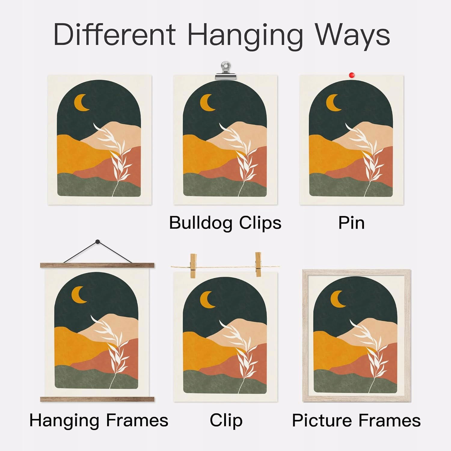 Różne sposoby zawieszenia możesz użyć klipsów, ramek wiszących lub ramek do zdjęć, aby powiesić je na dowolnej ścianie, którą chcesz ozdobić. Gotowe do powieszenia! Obrazy sprzedawane są bez ram