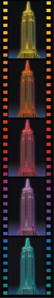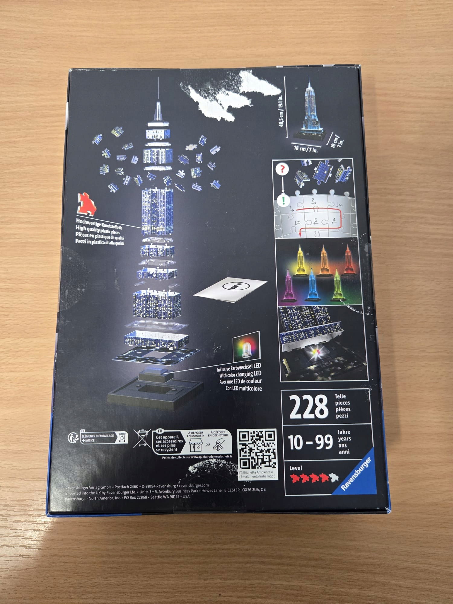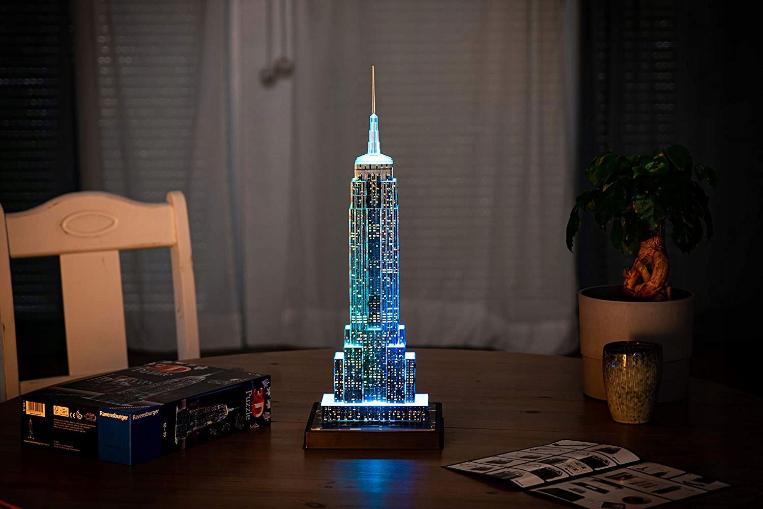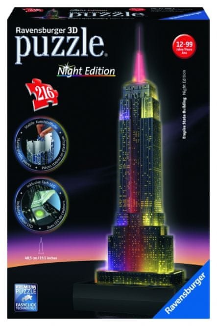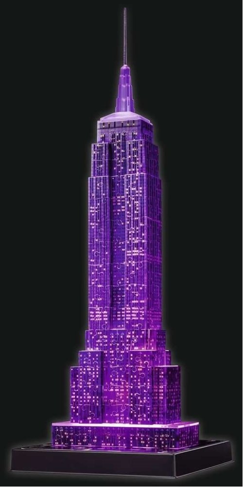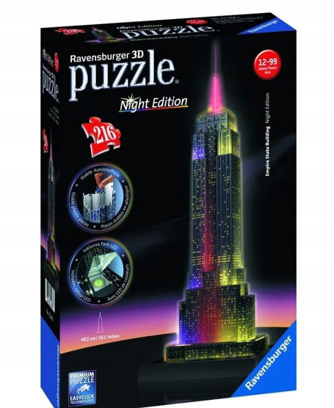 Puzzle 3D Ravensburger Empire State Building w wersji nocnej to wyjątkowa układanka, która po złożeniu zamienia się w imponujący model jednego z najsłynniejszych budynków świata. Dzięki technologii LED gotowa konstrukcja rozświetla się pięcioma kolorami – czerwonym, żółtym, zielonym, niebieskim i różowym, które zmieniają się automatycznie, tworząc efektowną dekorację wnętrza. Elementy wykonane są z wysokiej jakości plastiku i łączą się stabilnie dzięki systemowi EasyClick, bez konieczności użycia kleju.