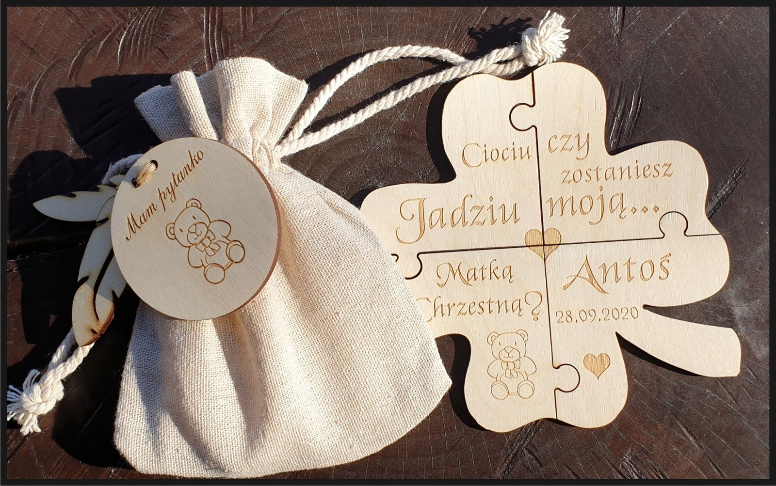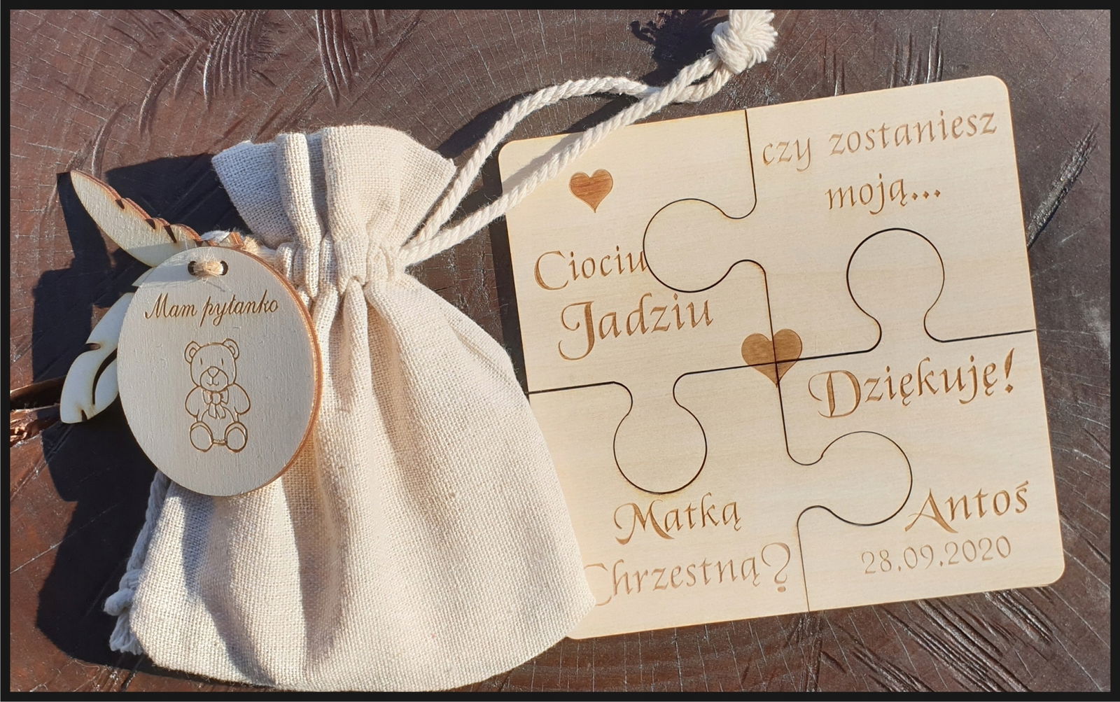 Oferujemy Państwu pytanie do Matki Chrzestnej/Ojca Chrzestnego w formie puzzli. Pozwala w oryginalny sposób poprosić wybraną osobę o sprawowanie tej zaszczytnej funkcji.Puzzle zapakowane są w w lniany woreczek o wymiarach 12x15cm.