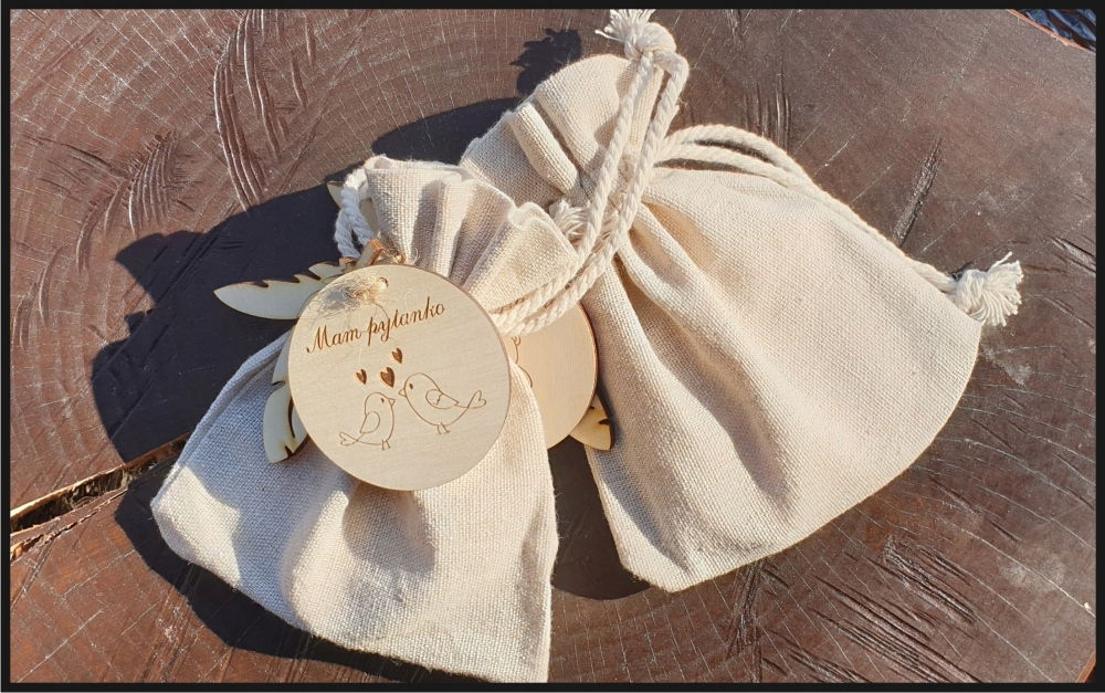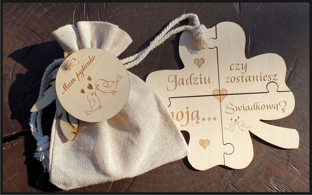 Oferujemy Państwu pytanie dla Świadka/Świadkowej w formie puzzli. Pozwala w oryginalny sposób poprosić wybraną osobę o sprawowanie tej zaszczytnej funkcji.Puzzle zapakowane są w w lniany woreczek o wymiarach 12x15cm.