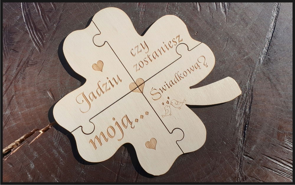 -  puzzle ze szlifowanej sklejki, składające się z czterech elementów w wybranym przez Państwa kształcie