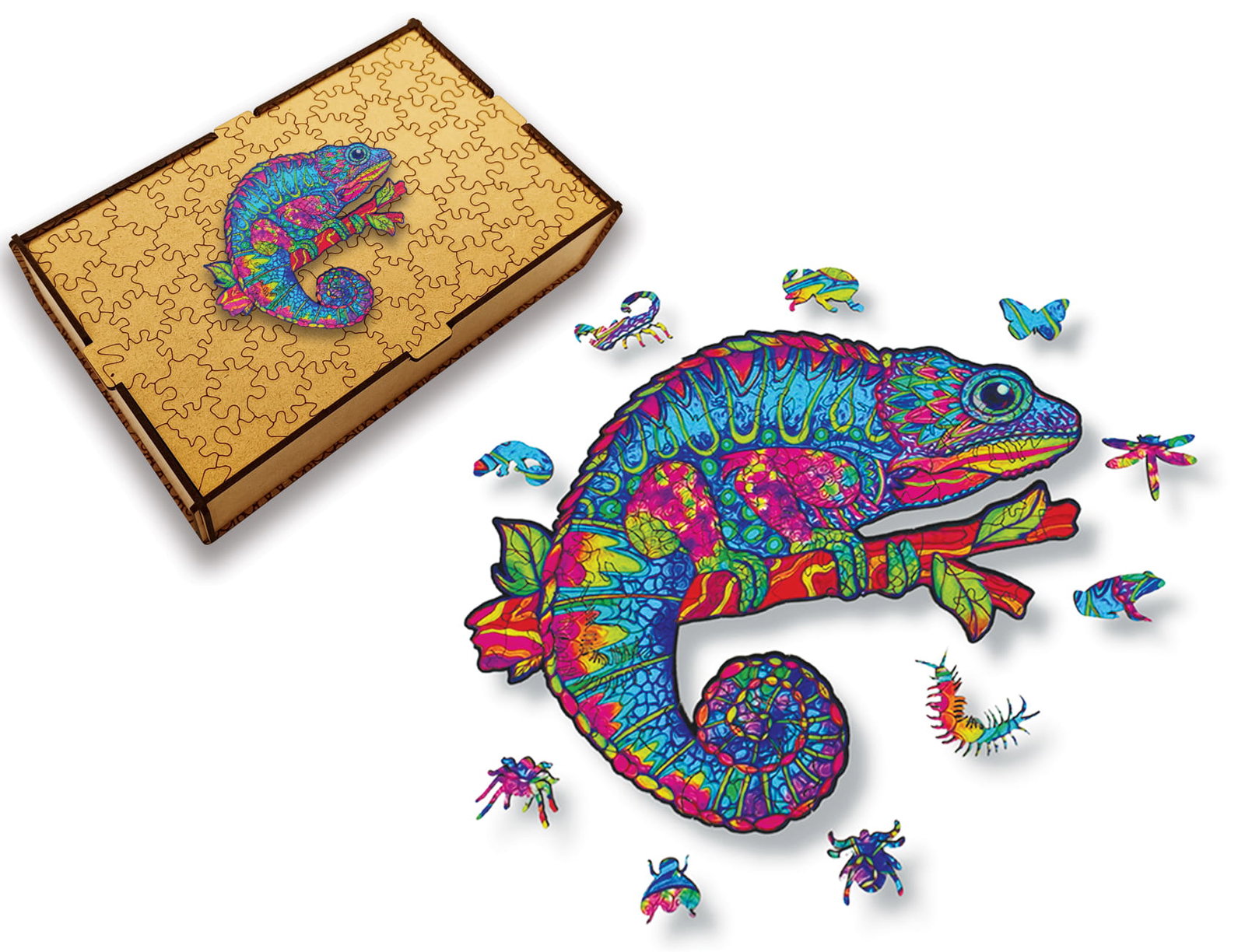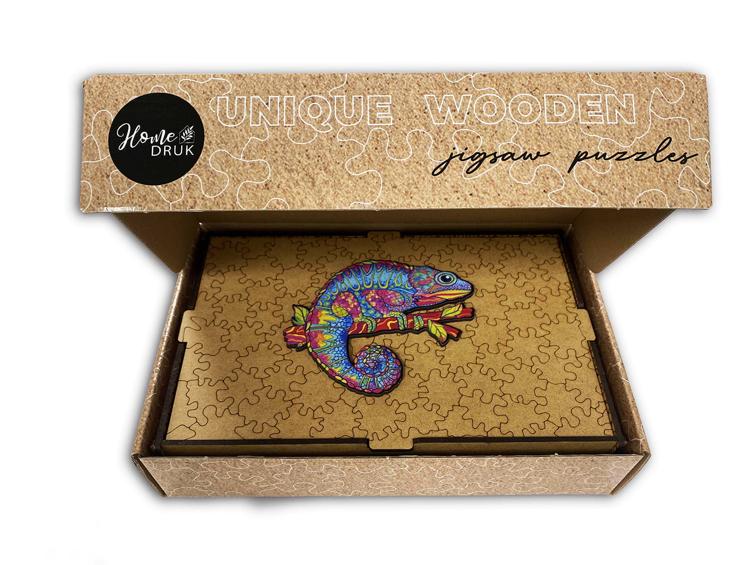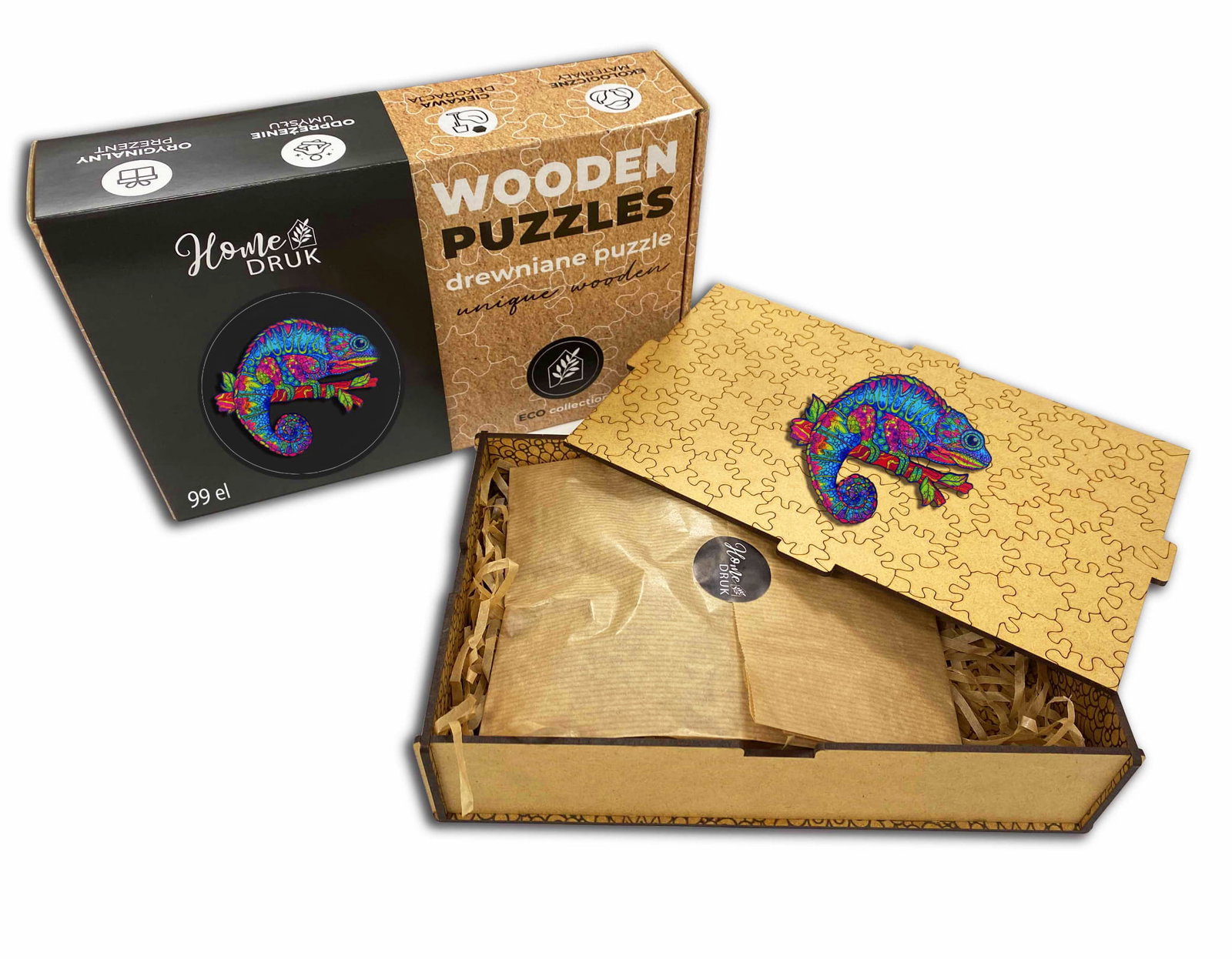 Puzzle Drewniane dla dzieci i dorosłych KAMELEON w pudełku drewnianym
