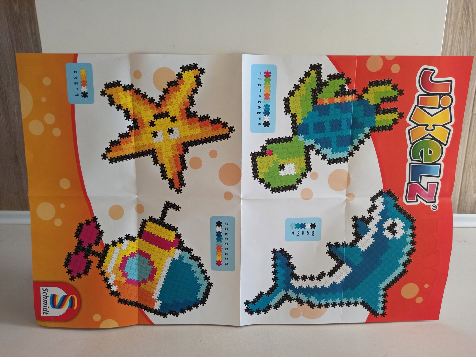 - 5 wzorów do ułożenia: 4 mniejsze - delfin, rozgwiazda, żółw, łódź podwodna lub 1 bardzo duży - kolorowa ryba tropikalna.