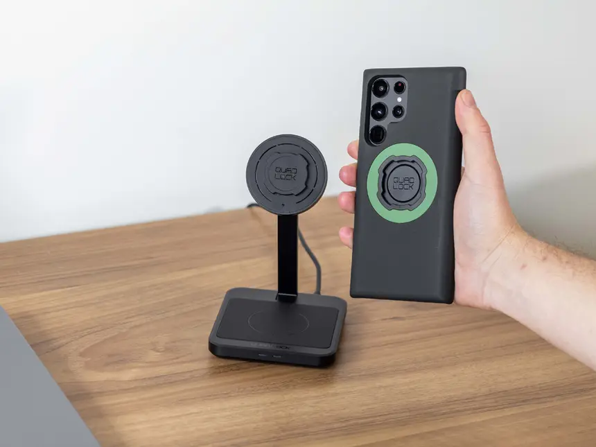 - Wersja MAG CASE - Obsługuje magnetyczne akcesoria i dodatki z serii MAG CASE oraz ładowarki bezprzewodowe (indukcyjne). Dodatkowo wersja MAG CASE została zaprojektowana pod kątem jak największej kompatybilności z ładowarkami indukcyjnymi. Zaleca się używanie ładowarek Quad Lock. Kompatybilność z ładowarkami innych producentów może się różnić w zależności od wersji oprogramowania i konkretnego modelu.