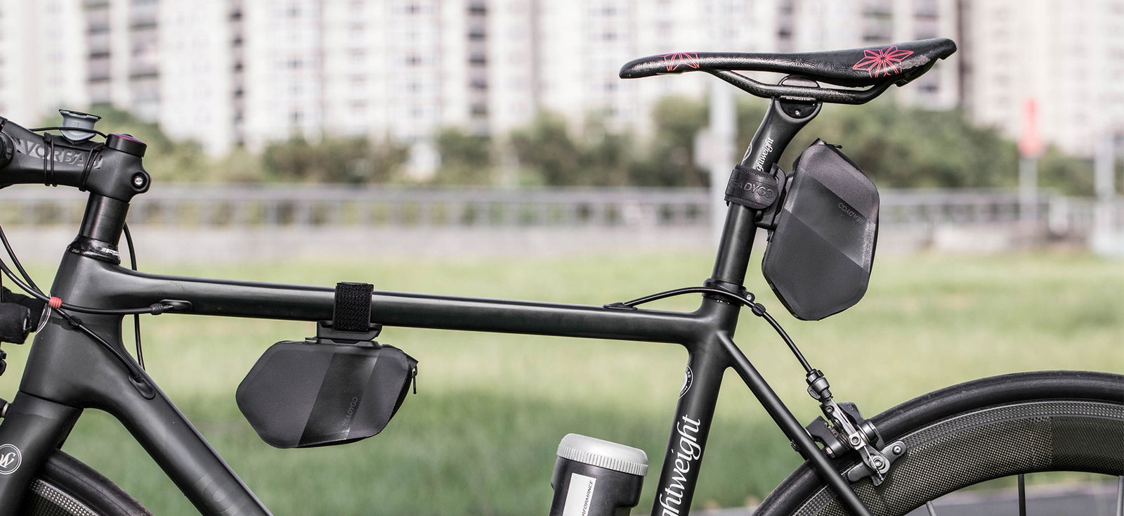 - Montaż: Uchwyt na rzepy z szybkim systemem wypinania torby. Możesz zamontować na sztycy lub rurze ramy.