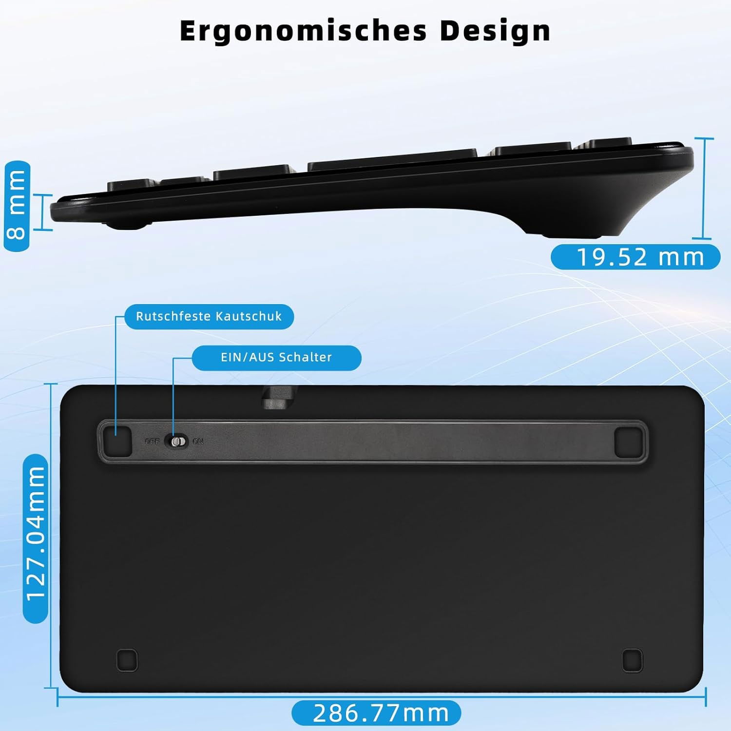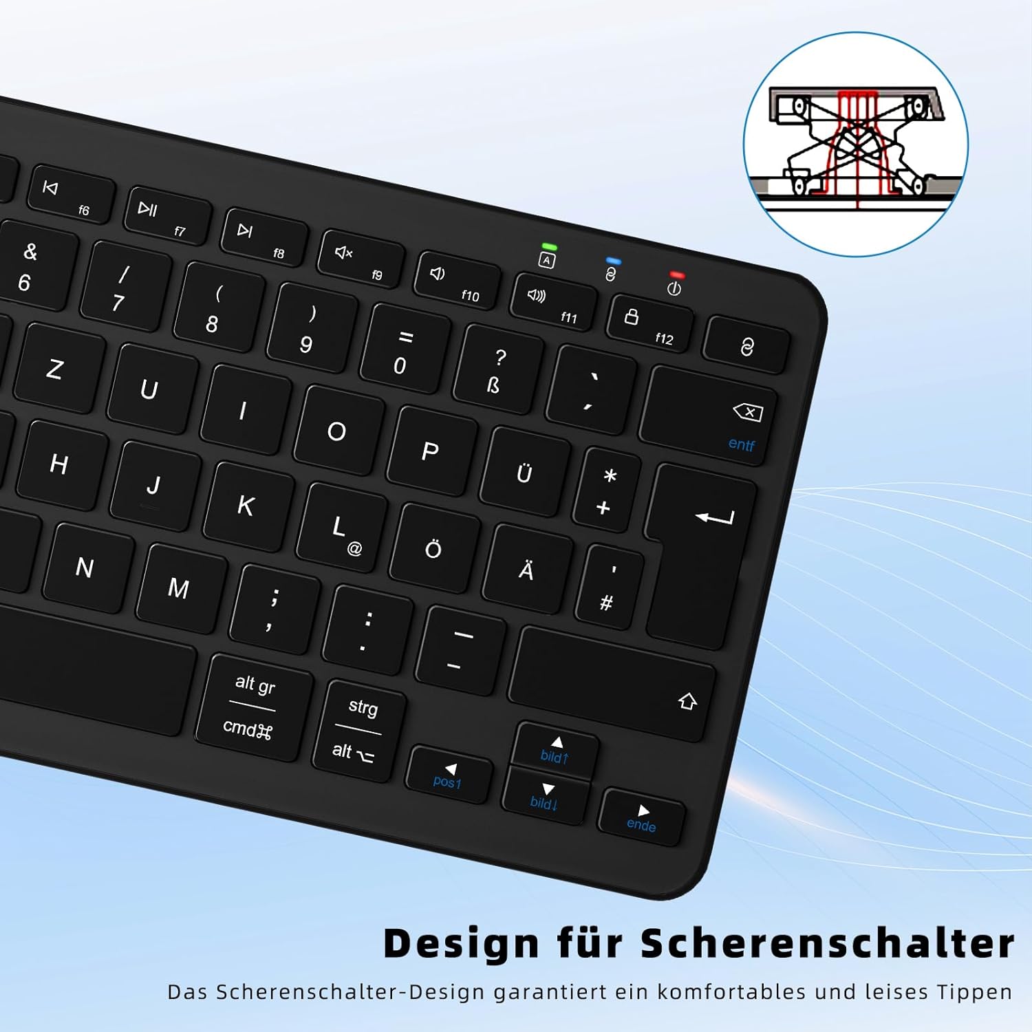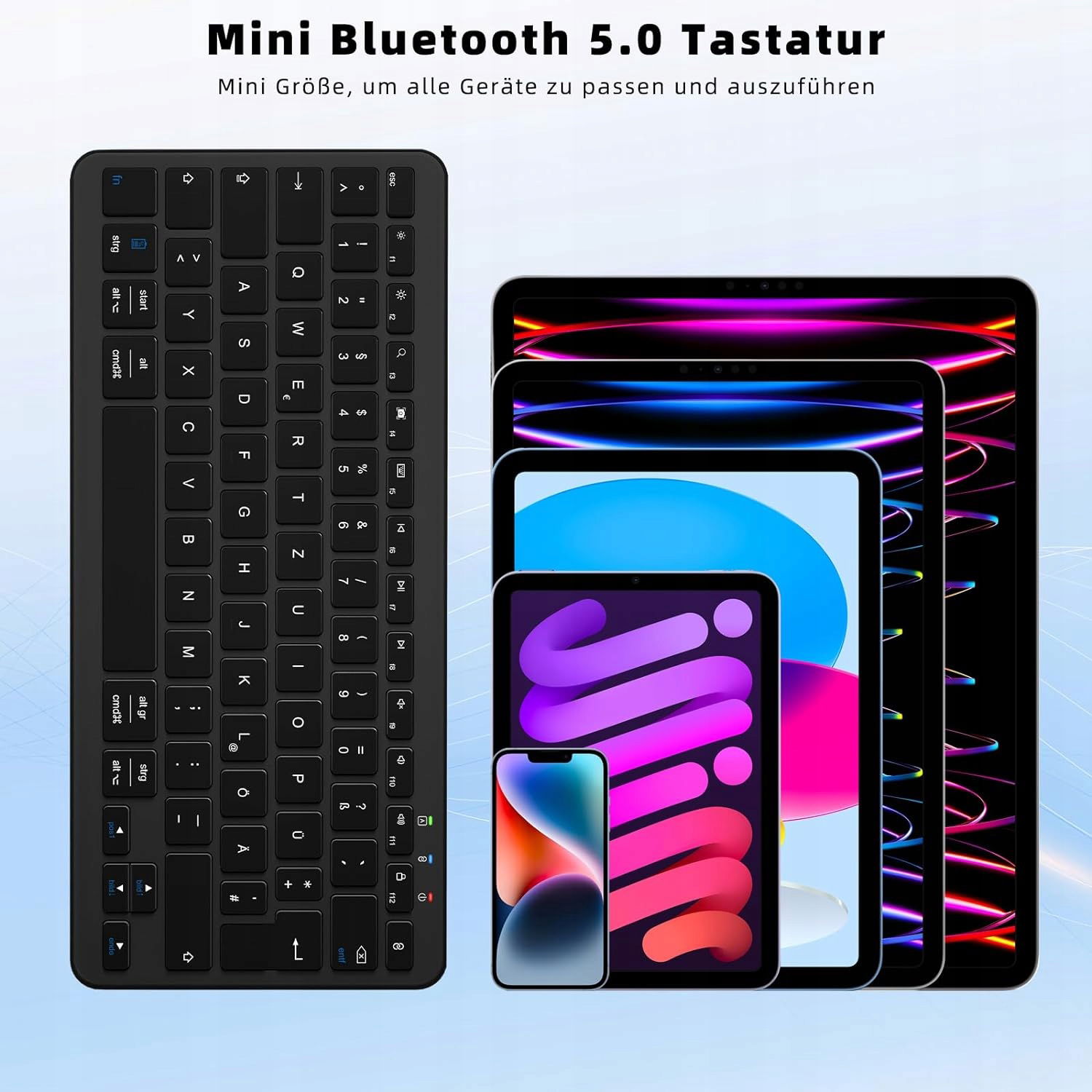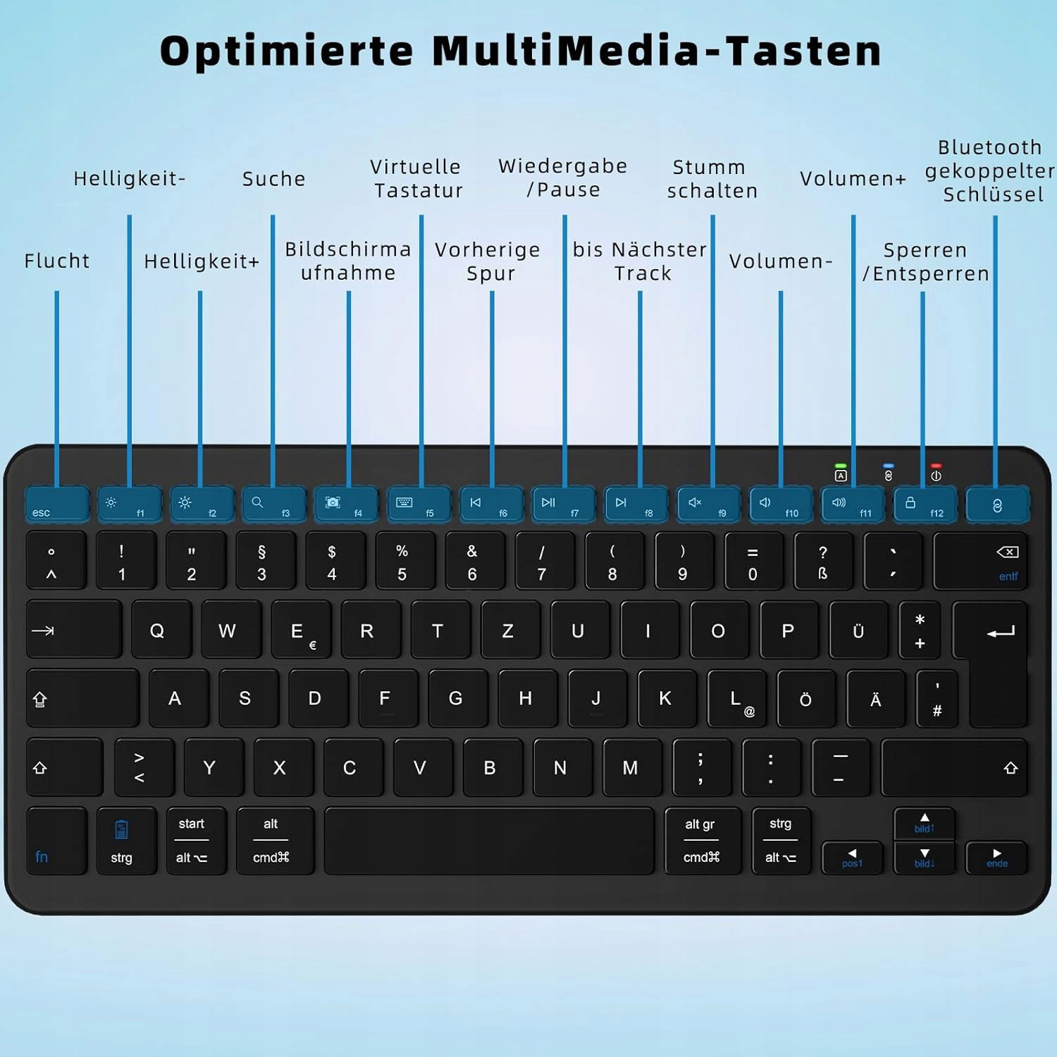 Ergonomiczna konstrukcja: płaskie przyciski nożycowe zapewniają płynne, ciche pisanie przypominające laptopa. Lekka mini klawiatura Bluetooth jest łatwa do przenoszenia, dzięki czemu możesz wykonywać wielozadaniowość w domu, w pracy lub w podróży. Czas ładowania i długi czas pracy akumulatora: klawiatura pozostaje zasilana do 50 dni (2 godziny dziennie) przy pełnym naładowaniu i ładuje się za pomocą dołączonego kabla USB C przez ok. 3 godziny. Funkcja oszczędzania energii przełącza klawiaturę w tryb uśpienia po 30 minutach bezczynności. Technologia Auto Sleep, przycisk włączania/wyłączania (z tyłu klawiatury) i wskaźnik baterii pomagają zaoszczędzić więcej energii. Bezprzewodowe połączenie Bluetooth: Połącz się z telefonem/iPadem / tabletem/komputerem przez Bluetooth 5.0 bez kabla. Odległość robocza Bluetooth wynosi do 10 m, dzięki czemu ta mini bezprzewodowa klawiatura może być używana w gabinecie, bibliotece lub wszędzie tam, gdzie potrzebujesz. Uniwersalna kompatybilność: kompatybilny z trzema ważnymi systemami operacyjnymi, które obsługują Bluetooth (iOS, Android i Windows), w tym iPad Air z iPad Pro i iPad Mini z iPhonem z tabletami z systemem Android, takimi jak Samsung Galaxy Tab z systemem Windows itd. Klawiatura Qulose automatycznie rozpoznaje system operacyjny na aktualnie wybranym urządzeniu, co ułatwia użytkowanie.