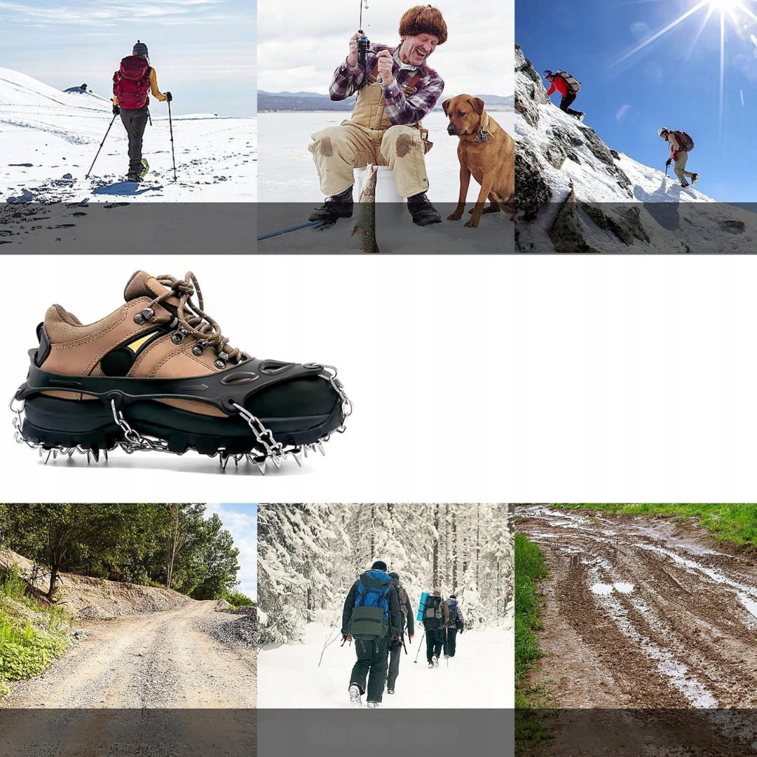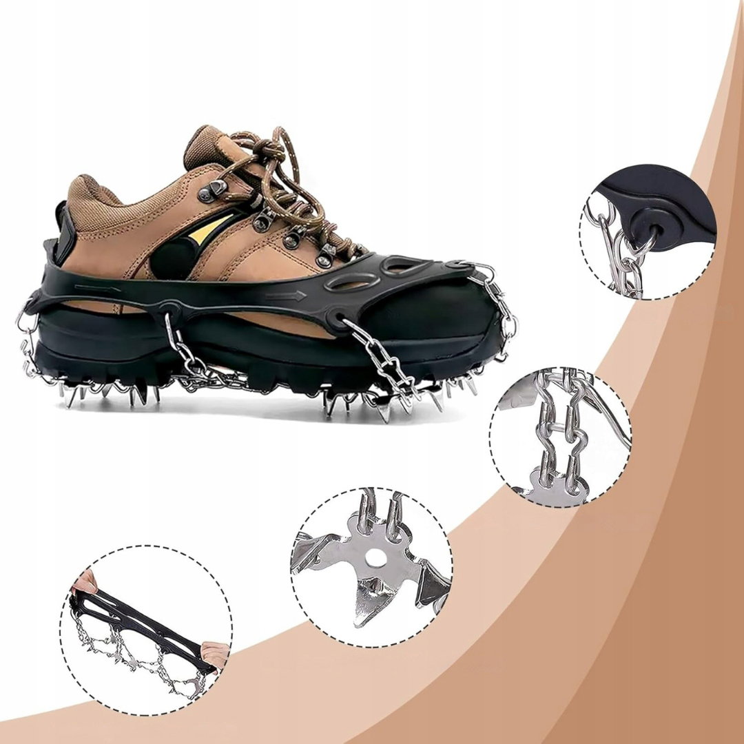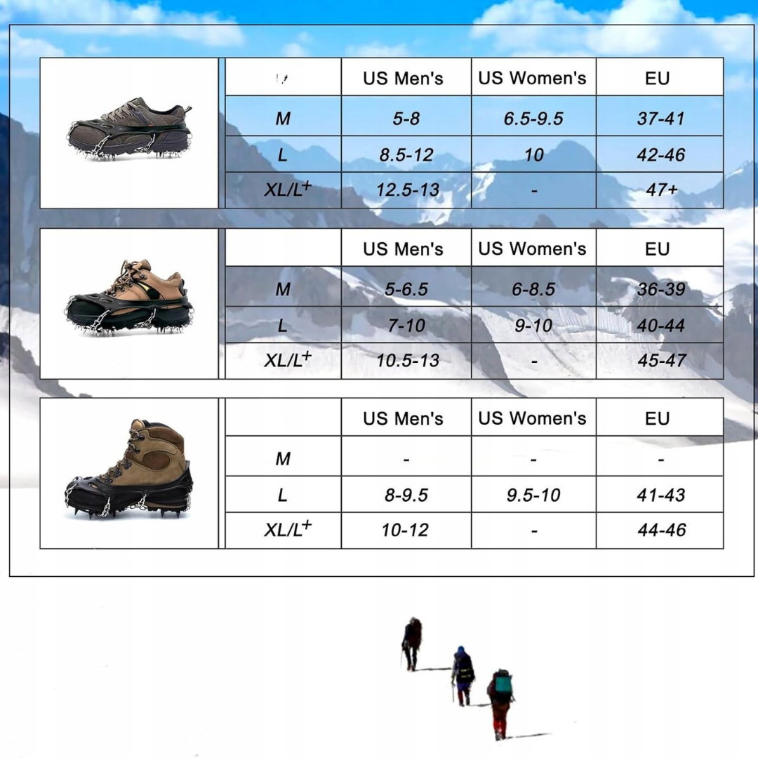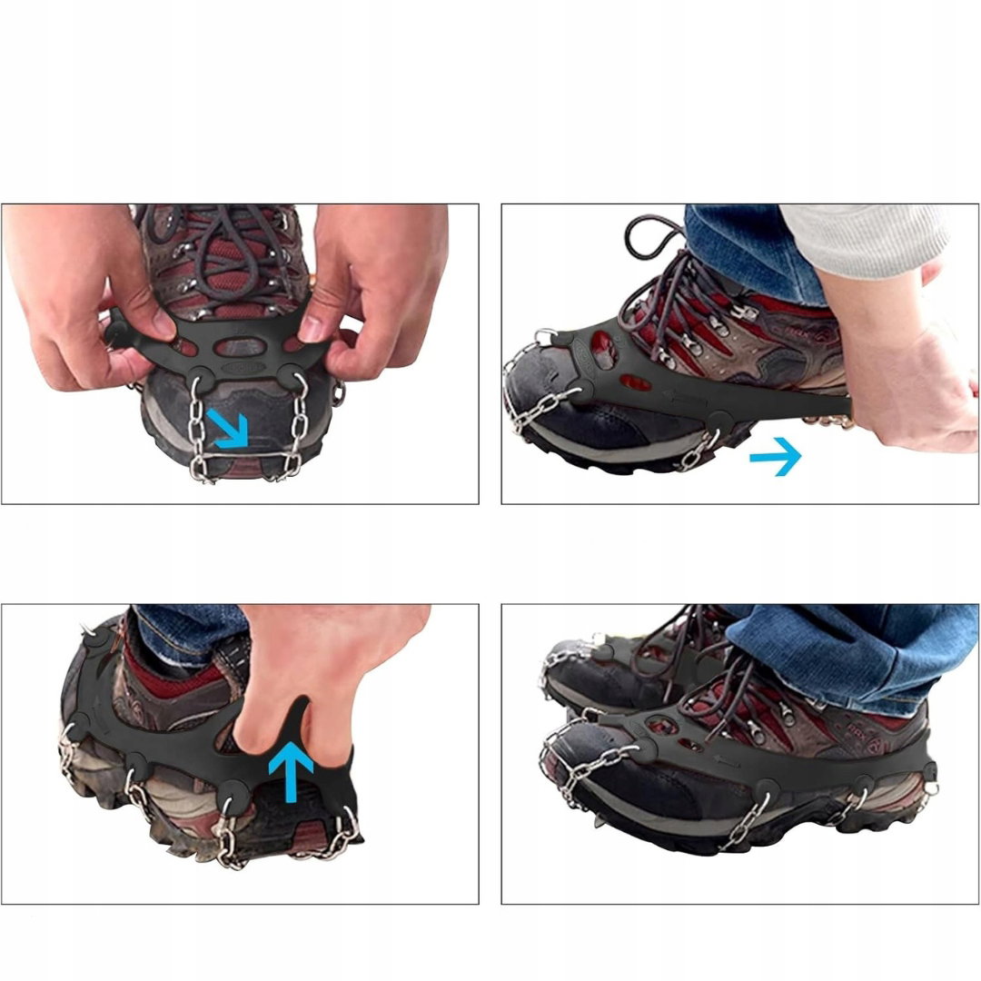 - Elastyczne i regulowane: pasują do różnych typów obuwia i rozmiarów stóp, od butów sportowych po trekkingowe, od casualowych po robocze. Lekki i poręczny, można je schować w małej torbie. Idealne nie tylko w górach, ale także w mieście w zimowe dni, sprawdzą się również dla dzieci i osób starszych.
