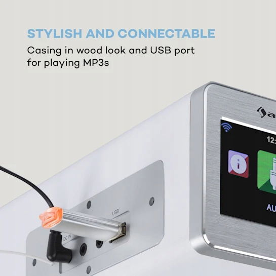 Stylowy i wszechstronny: biała obudowa i port USB do odtwarzania plików MP3.
