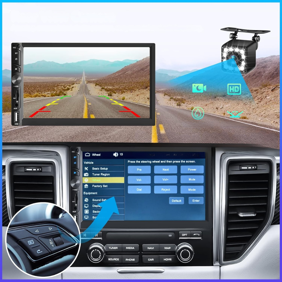 - Radio samochodowe z kamerą cofania i sterowaniem na kierownicy: radio wyposażone w kamerę cofania HD o szerokim kącie widzenia 120 stopni oraz funkcję noktowizji, co zapewnia wygodną i bezpieczną jazdę nawet w nocy lub podczas złych warunków atmosferycznych. Urządzenie obsługuje oryginalne sterowanie na kierownicy, pozwalając na zaprogramowanie przycisków zgodnie z indywidualnymi preferencjami użytkownika.