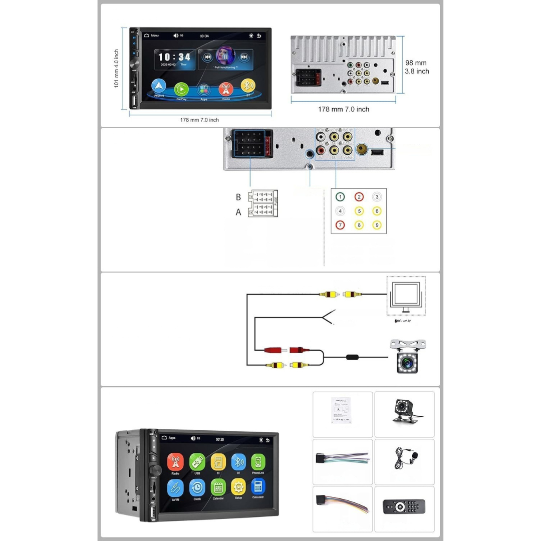 - Instrukcja instalacji radia podwójnego DIN: wymiary instalacyjne wynoszą 178 mm szerokości i 100 mm wysokości (7,01 x 3,94 cala). Radio posiada standardowe, uniwersalne złącze podwójnego DIN. Przed instalacją zaleca się sprawdzenie, czy oryginalna szczelina montażowa w samochodzie odpowiada wymiarom 7,01 cala szerokości oraz 3,94 cala wysokości.
