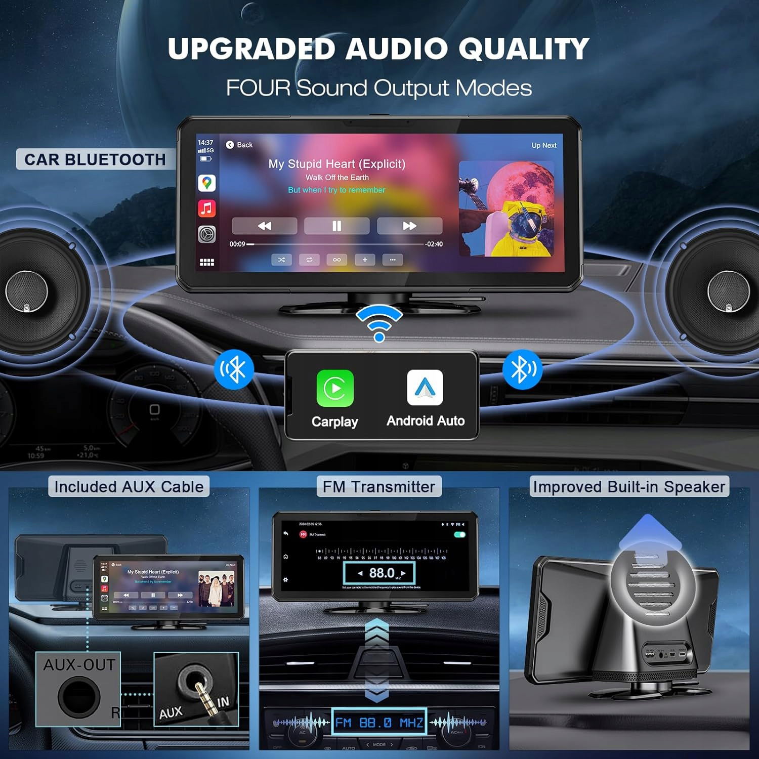 - 【Przenośny/uniwersalny】 Łatwa konfiguracja Plug and Play, gotowa do użycia w ciągu zaledwie jednej minuty! Zintegrowany uchwyt można bezpiecznie przymocować do deski rozdzielczej. Zapewnia pełny obrót ekranu o 360 stopni i regulację w górę i w dół dla optymalnego wyświetlania. Kompatybilny ze wszystkimi modelami samochodów 12-24 V. Odkryj wspólnie zalety adaptacji naszego wyświetlacza samochodowego z systemem Android !