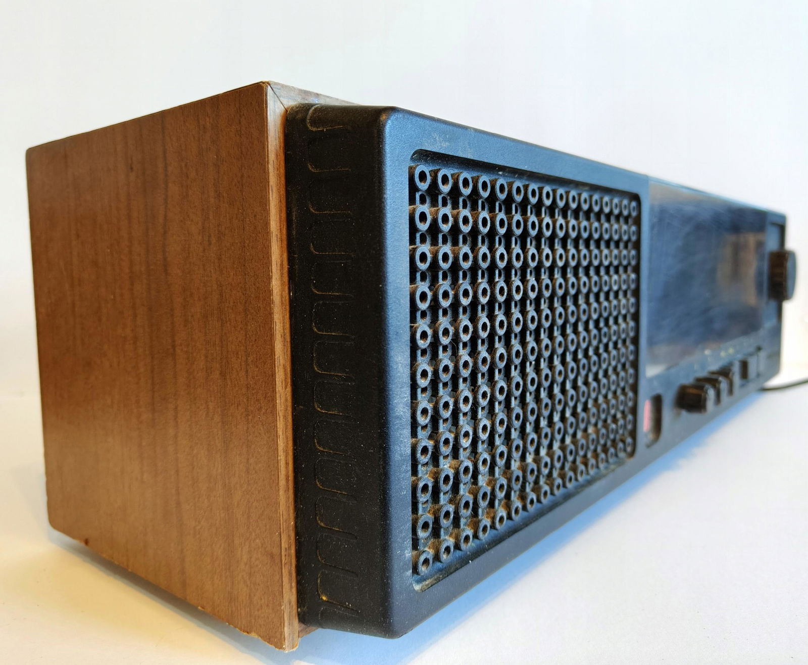 Radio w dość dobrym stanie, ale trochę brudne. Przestrojone, w niektórych miejscach odbiera na kawałku drutu, w innych potrzebuje lepszej anteny. Obudowa rozklejona z jednej strony od dołu, wzmocniona tylko zszywkami. Spalone żarówki podświetlenia skali. Przycisk zasilania zaciął się przy próbach włączania i wyłączania. Teraz jest włączony na stałe.