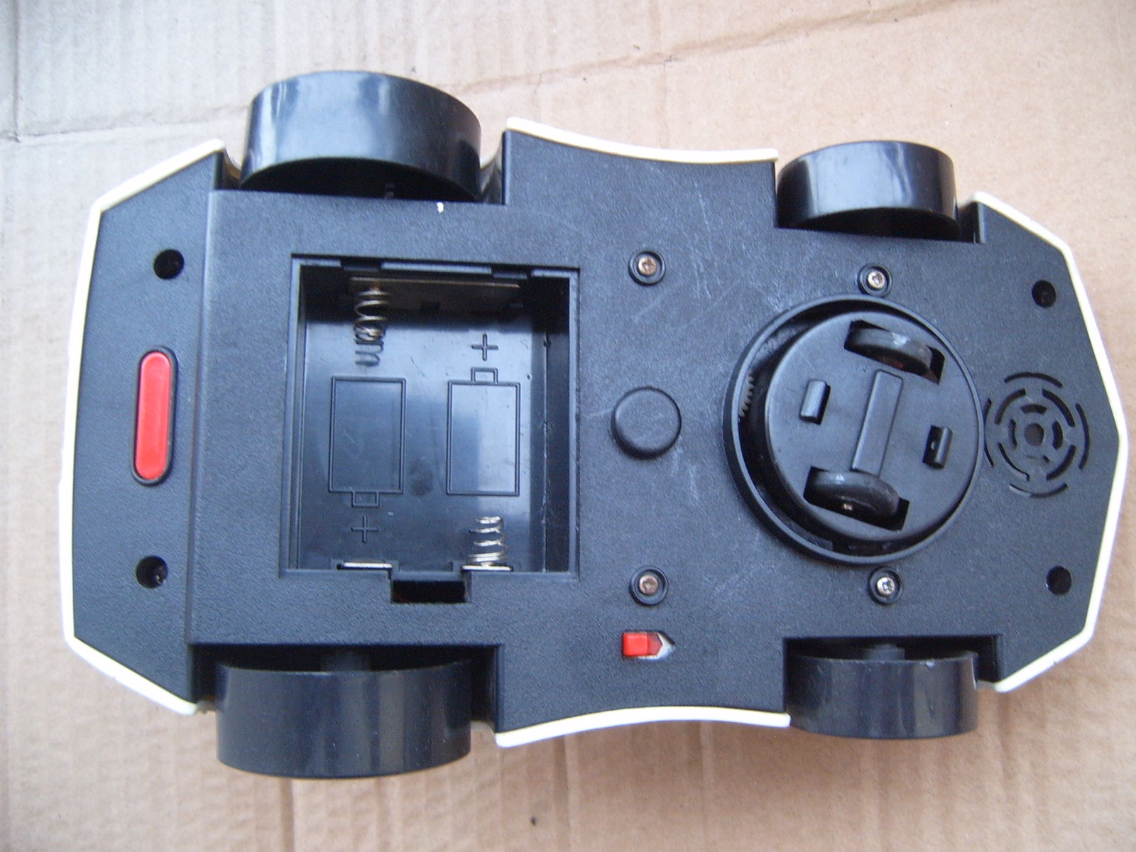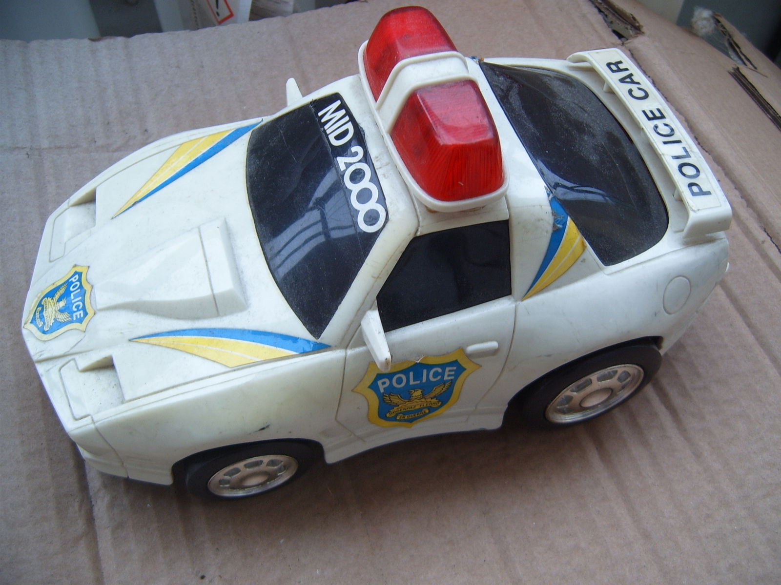 Widoczny na zdjeciach radiowoz jezdzi, skreca, trabi, hamuje, co jak na takiego yougtimera az nadto :) A tak na serio dzialaja wszytskie swiatla i silnik. Jedynie do czego moglbym sie doczepic to to ze czesciej chce skrecac niz jedzie prosto, ale to najprawdpododobniej efekt zuzycia gumowych kolek jezdnych. Stan zewnetrzny jak widac. Brak klapki na baterie. Wymiary zewn 11x12x21cm.