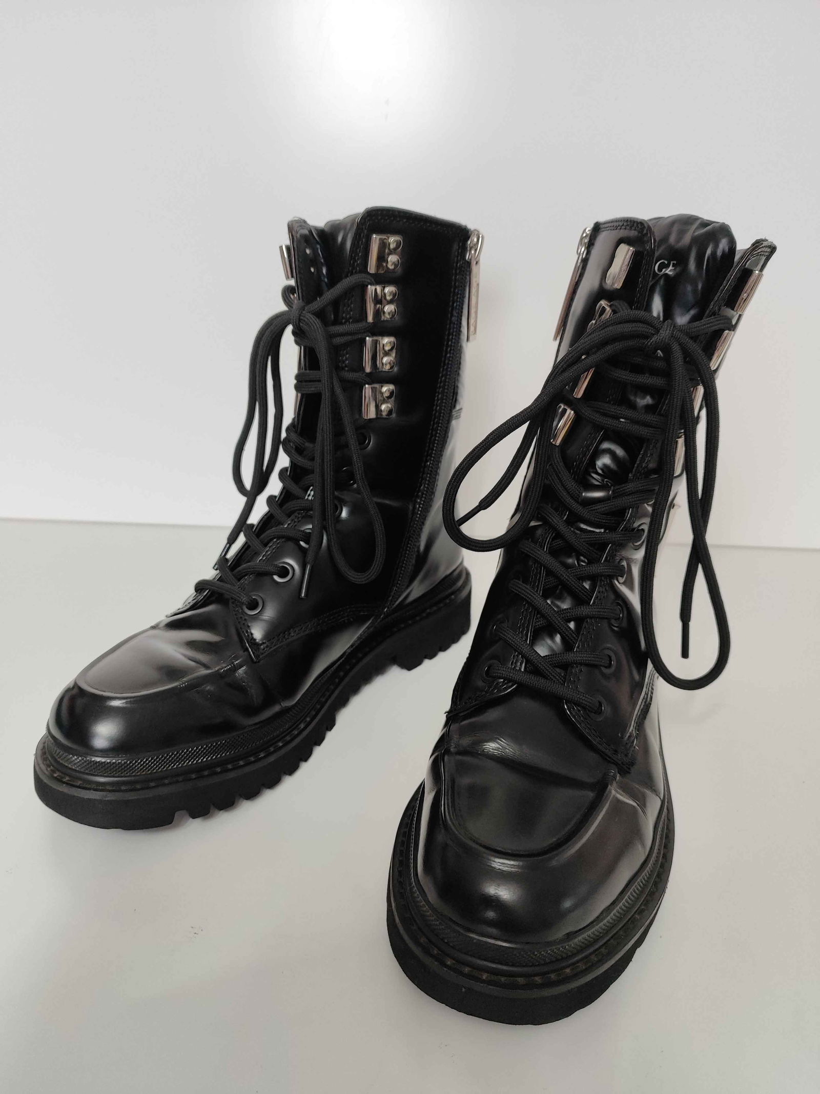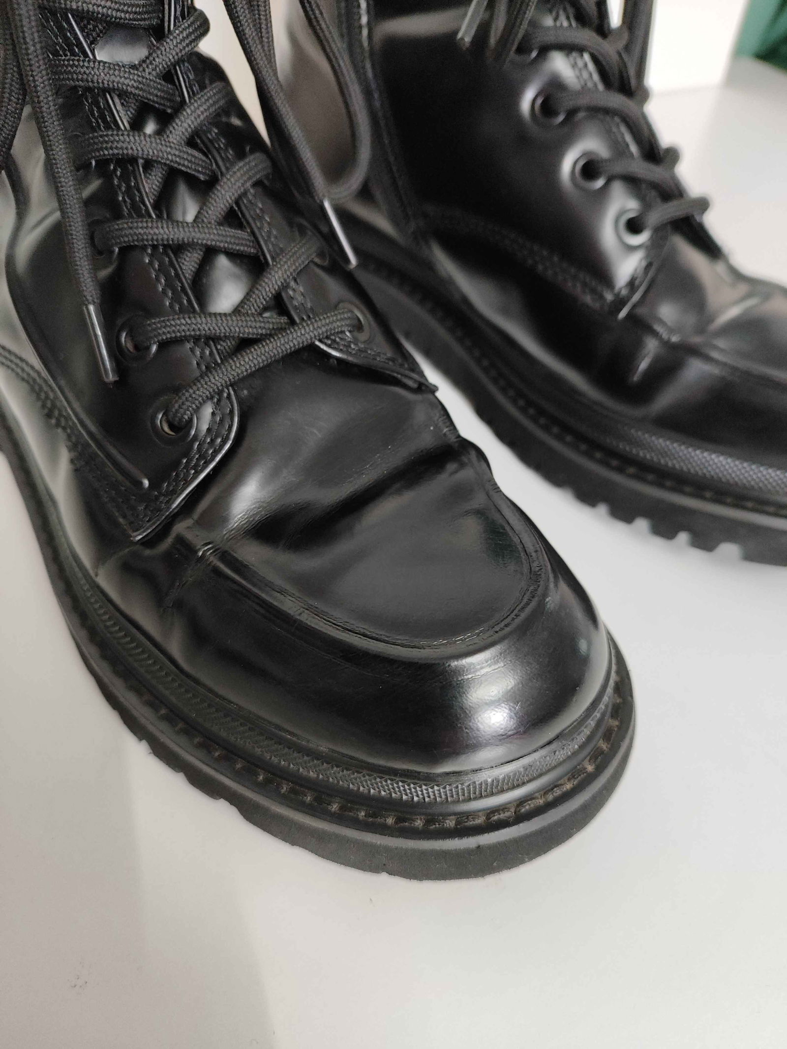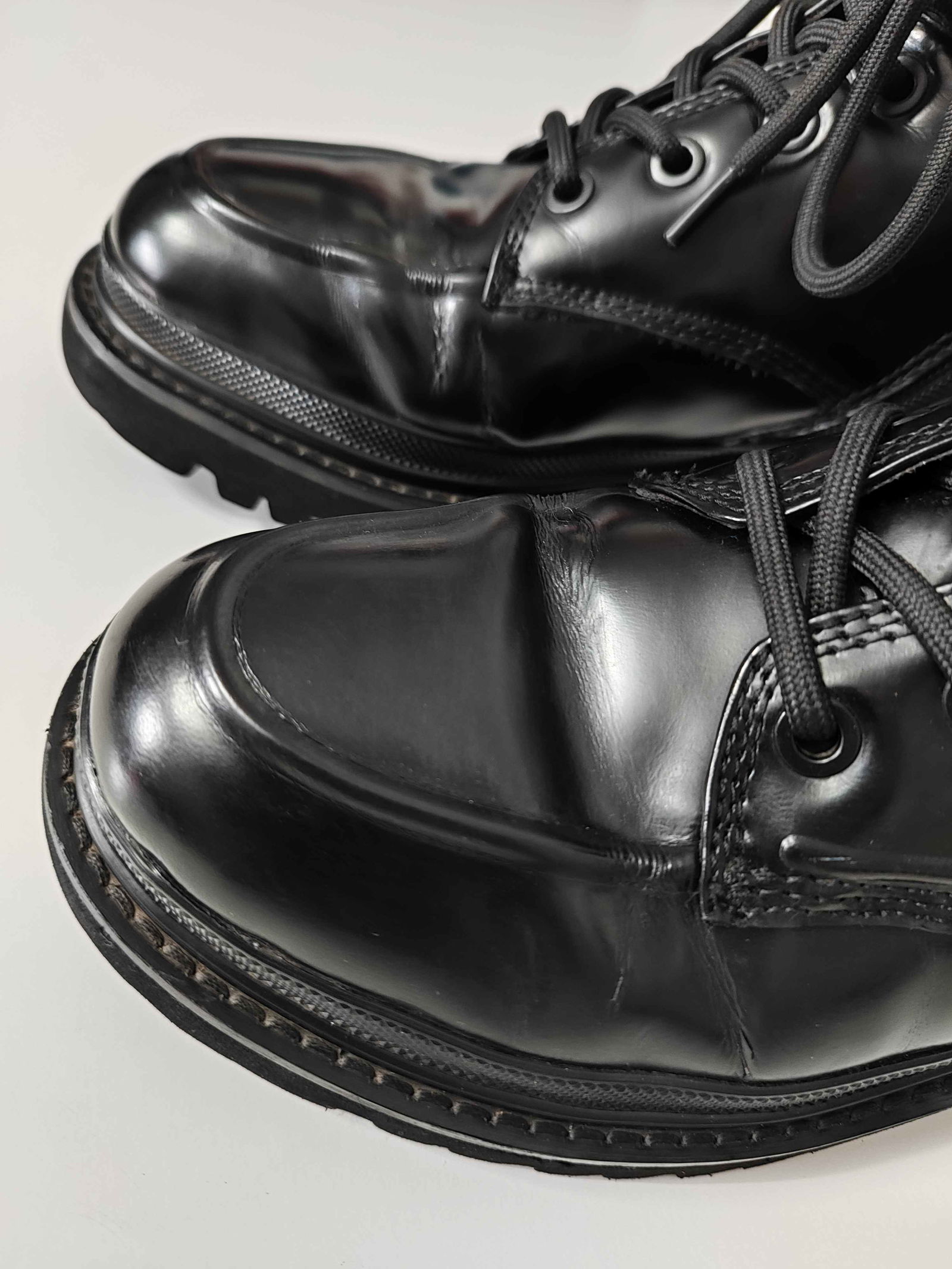Delikatne zagniecenia przy palcach – pokazane na zdjęciach. Podeszwa w świetnym stanie. Wnętrze czyste, suwak, zamki i sznurówki w pełni sprawne.