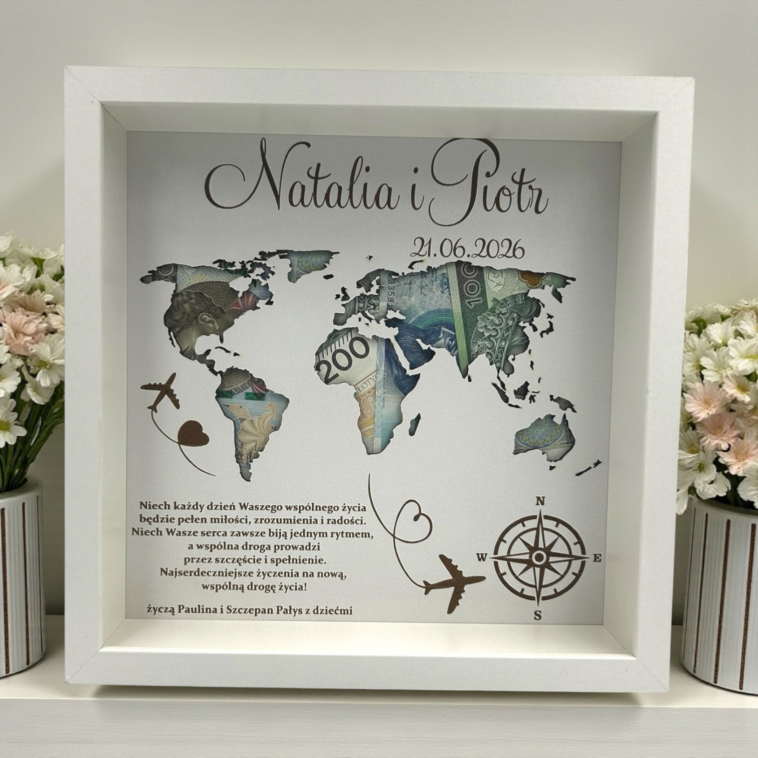 Ramka 3D na ślub – mapa świata prezent na pieniądze