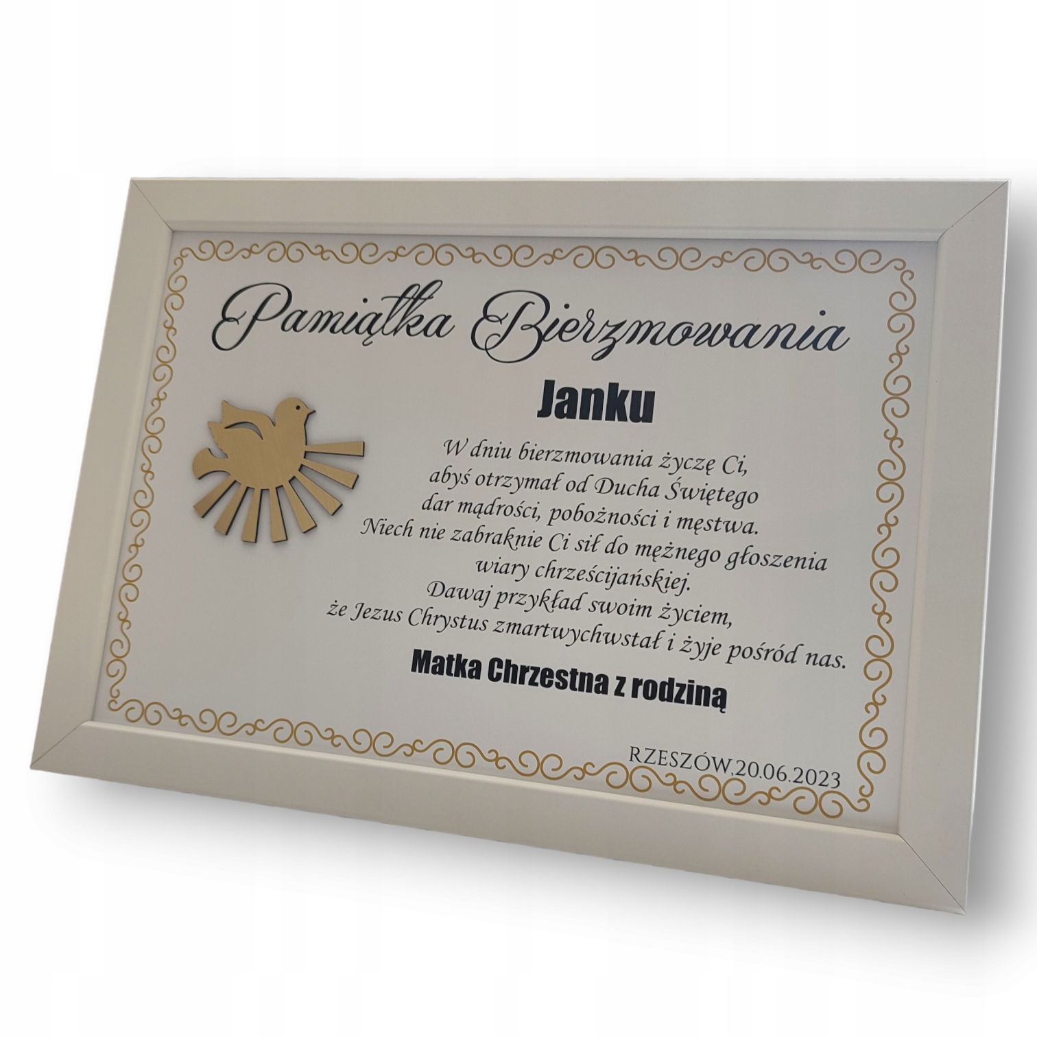 Na plakacie znajdują się również życzenia: „Pamiątka Bierzmowania”, które zostały umiejscowione nad ozdobą ze złotego laminatu.