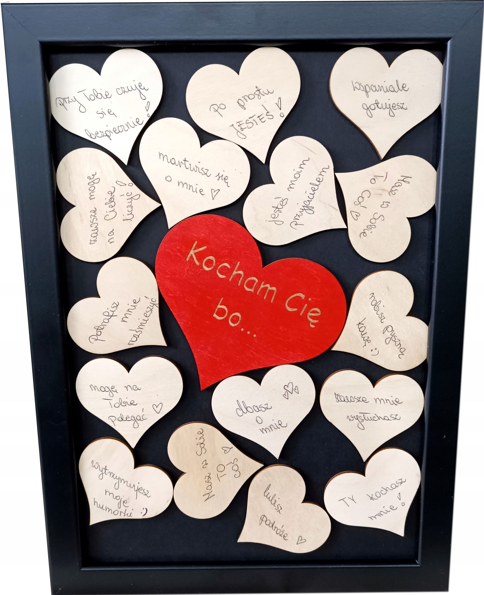 Stojąca ramka z okazji Walentynek z serduszkami do samodzielnego wpisania za co kochasz swoją drugą połówkę.