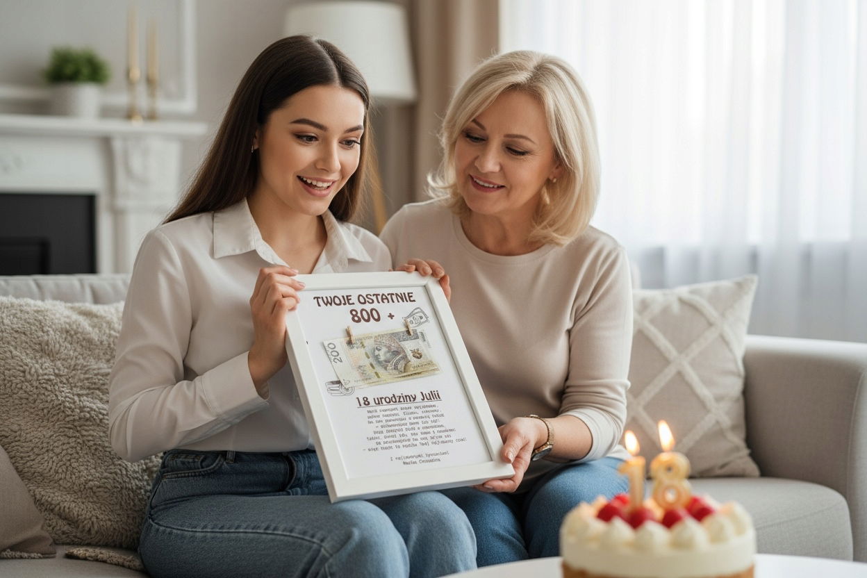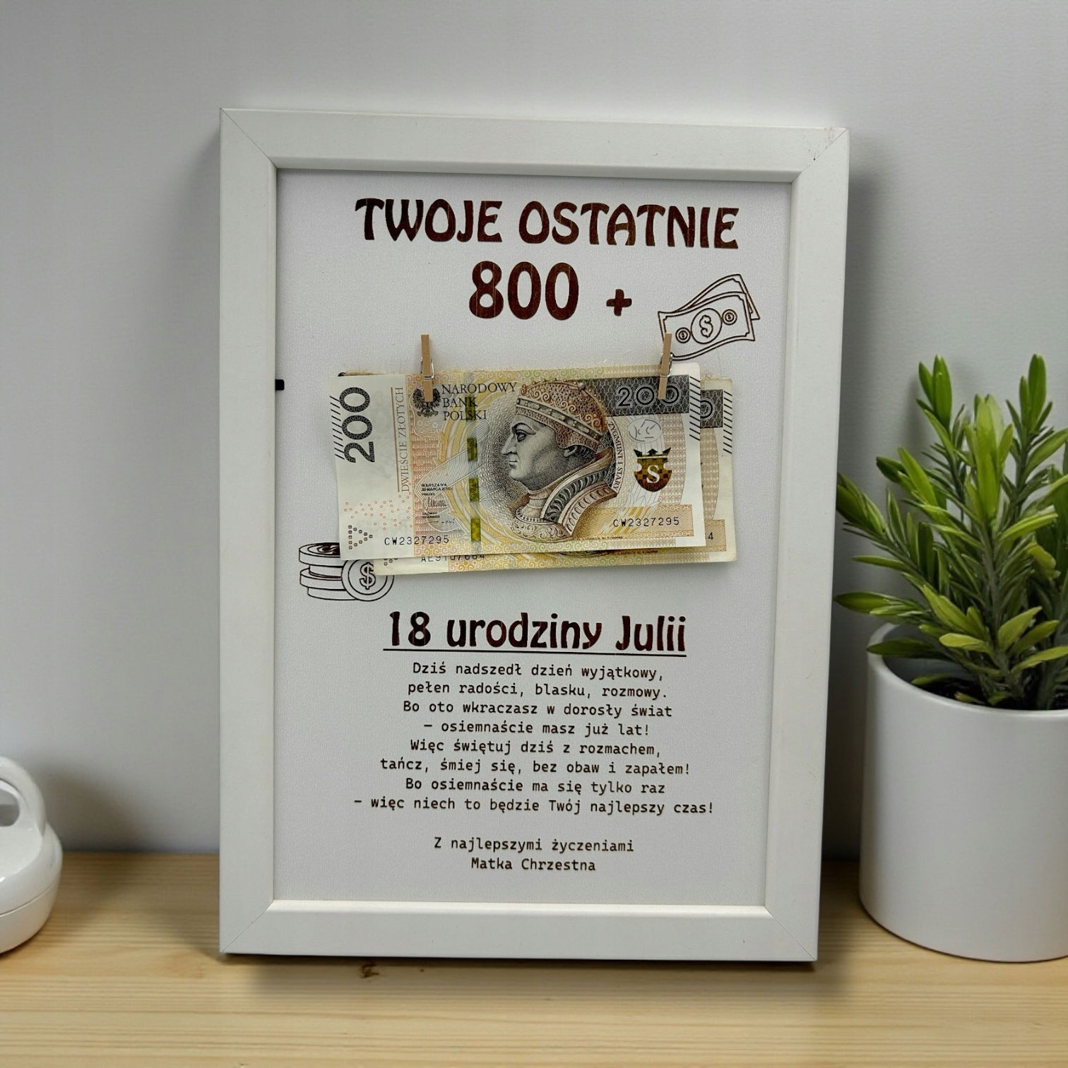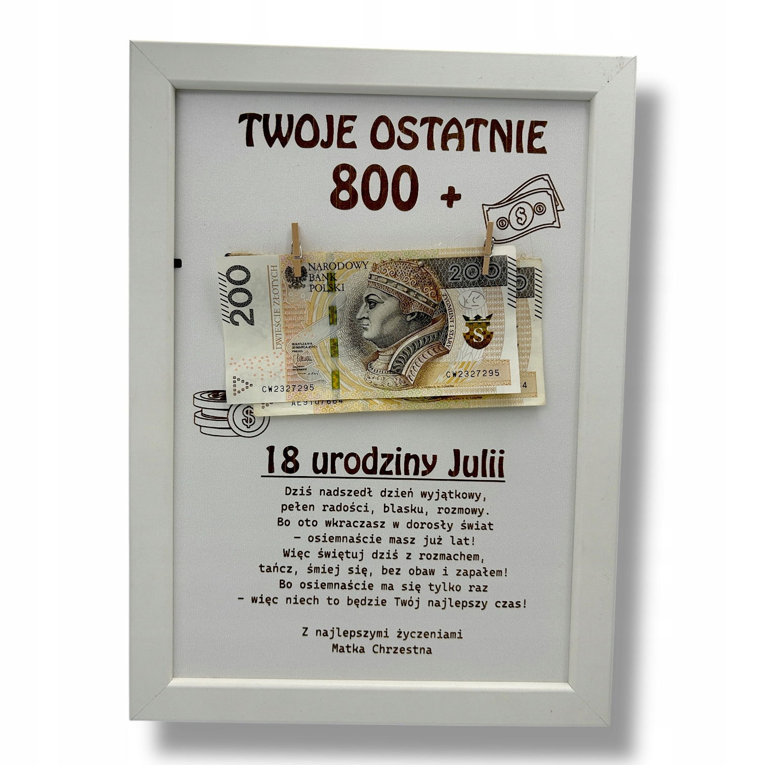 Ramka z pieniędzmi na 18 urodziny – „Twoje ostatnie 800+”