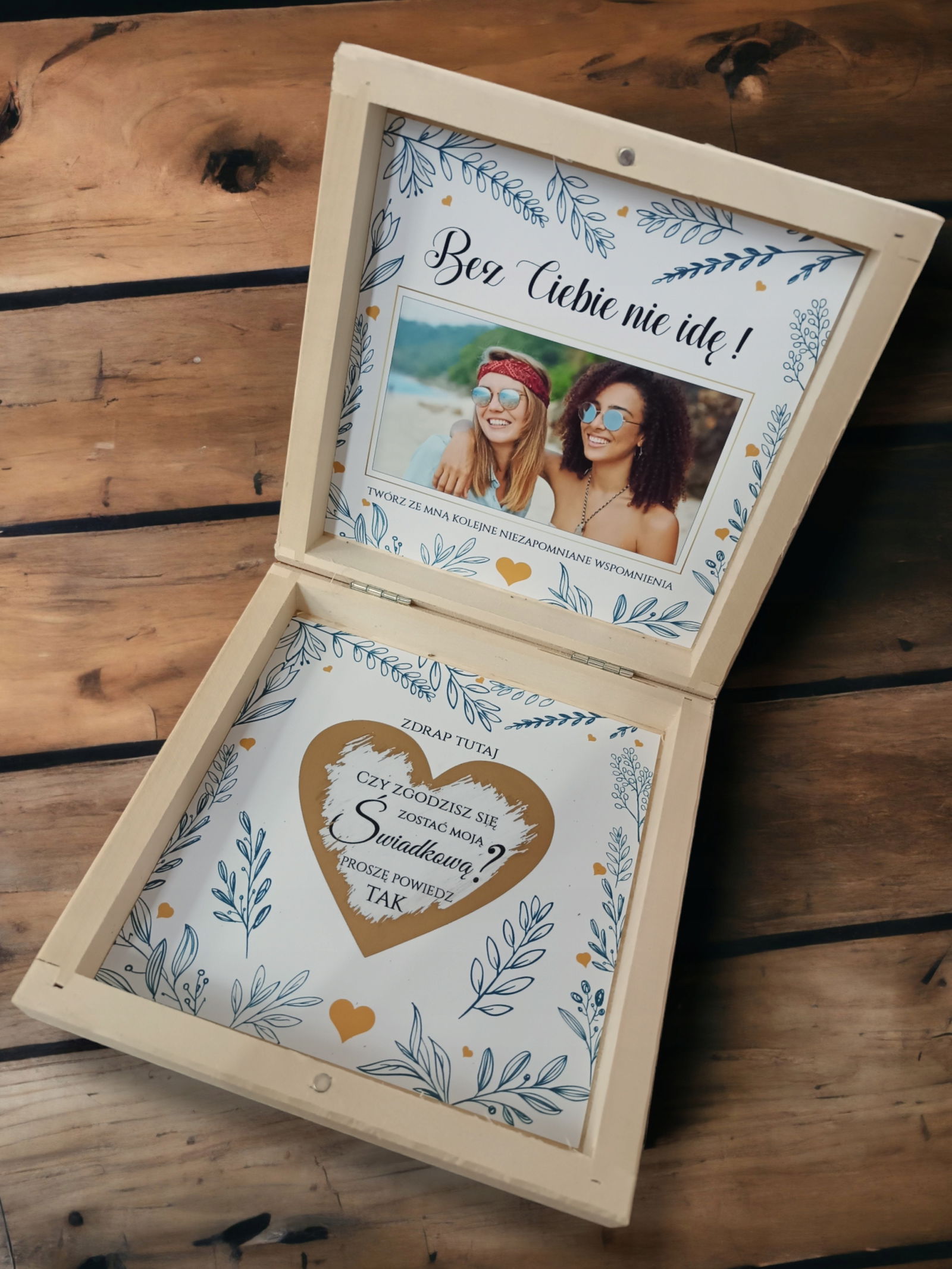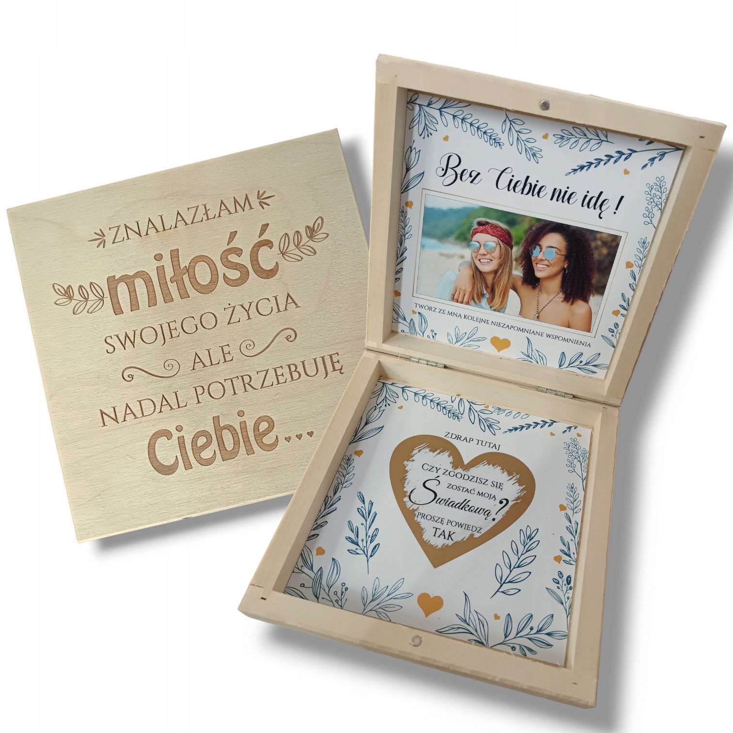 Oferujemy Państwu pytanie dla Świadkowej w oryginalnej formie pudełeczka z grawerem. Pozwala w oryginalny sposób poprosić wybraną osobę o sprawowanie tej zaszczytnej funkcji.Wewnątrz znajdują się nadrukowane kartki, na jednej umieszczone jest zdjęcie, na drugiej zdrapka. Całość ma nietypową formę, będzie wspaniałą pamiątką.