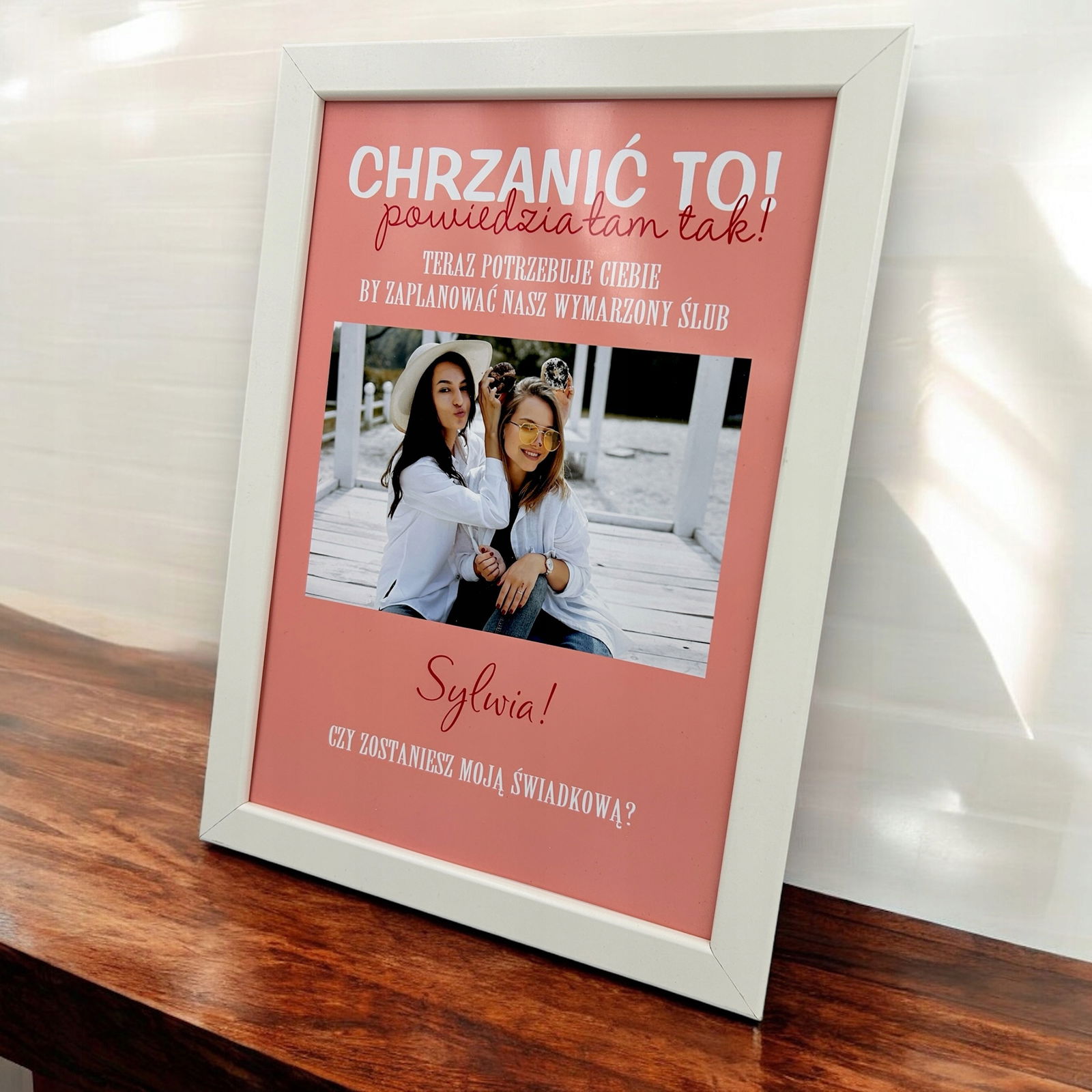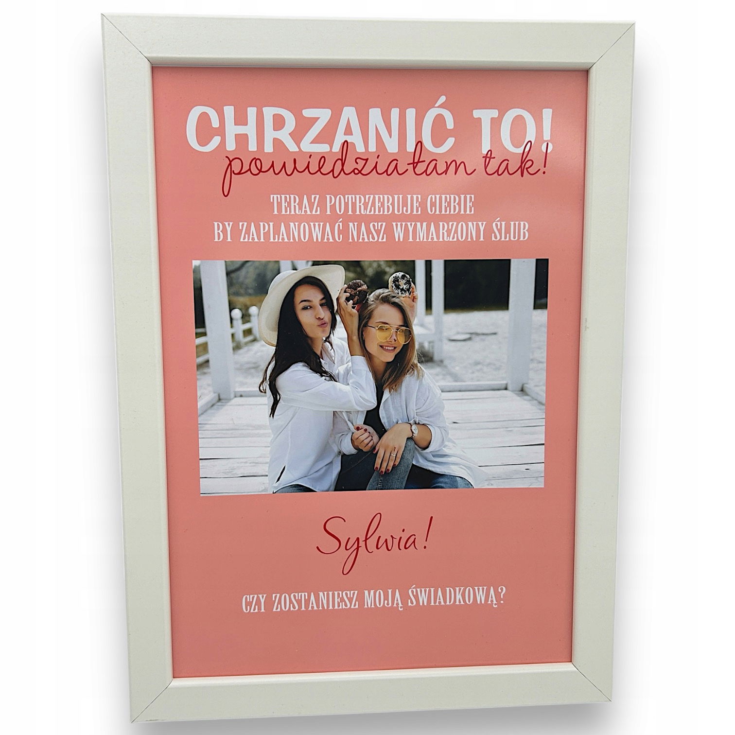 Oferujemy Państwu pytanie dla Świadkowej w oryginalnej formie białej ramki a4. Pozwala w oryginalny sposób poprosić wybraną osobę o sprawowanie tej zaszczytnej funkcji.W ramce znajdują się nadrukowane kartka ze zdjęcie. Całość ma nietypową formę, będzie wspaniałą pamiątką.