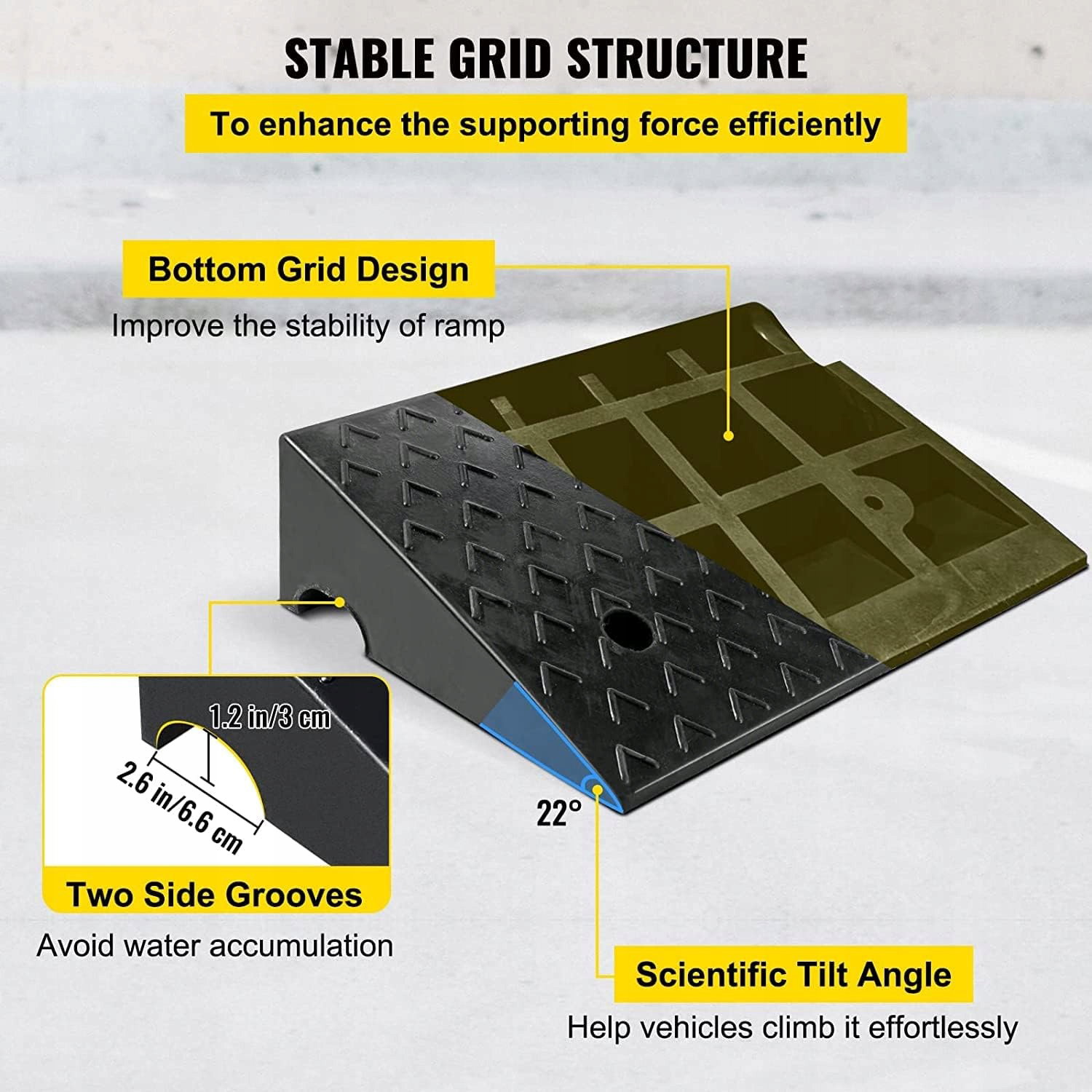 Antypoślizgowa tekstura: powierzchnia tej rampy do krawężnika ma antypoślizgową teksturę, która może zwiększyć tarcie i zapobiec ślizganiu się dla większego bezpieczeństwa, a także ma dobry efekt antypoślizgowy w deszczowe lub śnieżne dni. Poszerzony rowek u podstawy każdej rampy do krawężnika może przepuszczać wodę, aby zapobiec gromadzeniu się wody na ziemi w deszczowe dni