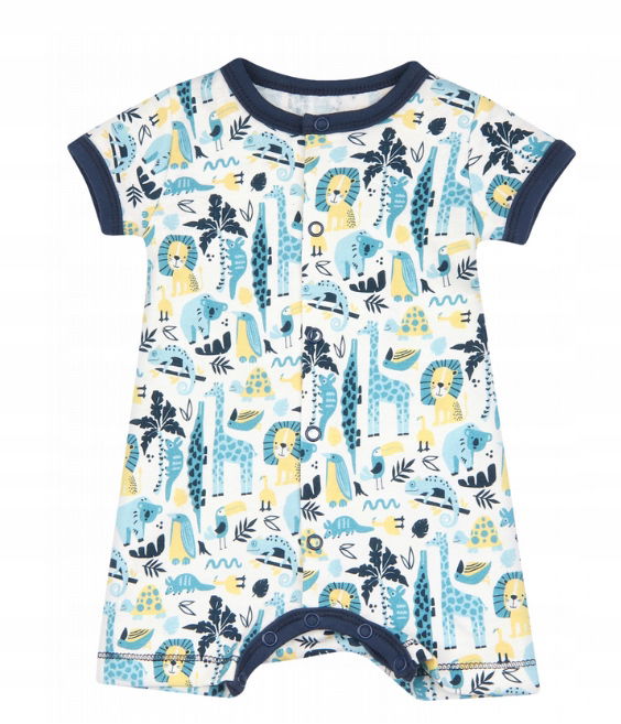 Bawełniany rampers, uszyty z miękkiej i przyjemnej w dotyku dzianiny bawełniane. Zapinany na zatrzaski na całej długości oraz w kroku na bez niklowe napy.