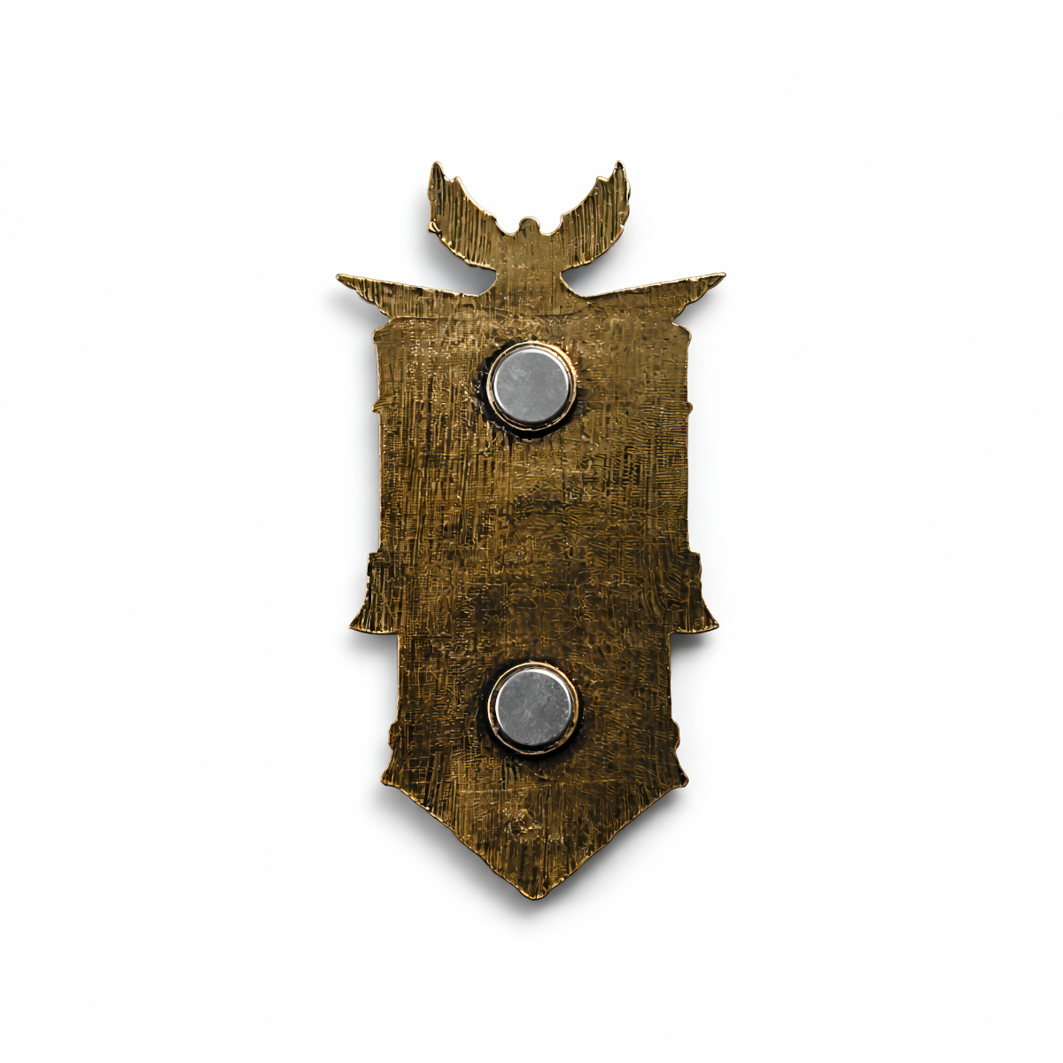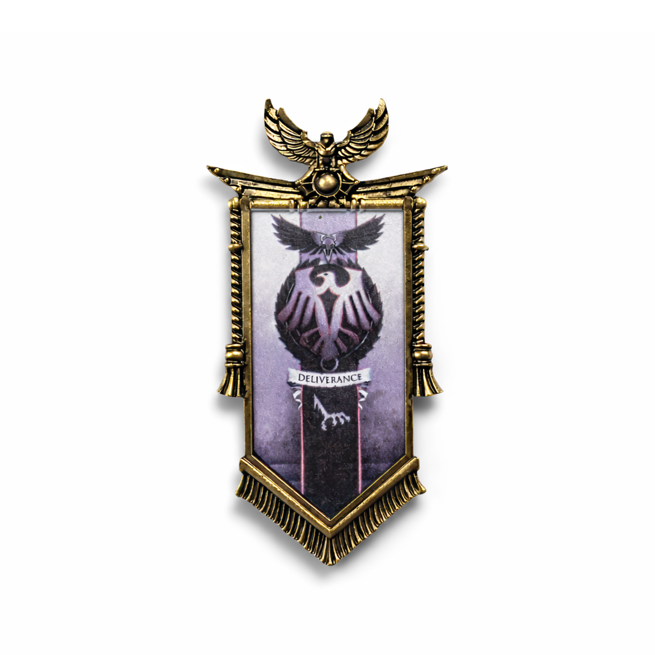 Z mrocznych niebios Deliverance Krucza Gwardia uderza bez ostrzeżenia — a Raven Guard Banner przenosi ten sam klimat skradania i dumy prosto do Twojej przestrzeni w naprawdę „ekspozycyjnej” formie. Przy 22 cm to metalowy magnes, który wygląda jak miniaturowy sztandar rozdziału: wysoki, wyrazisty i od razu czytelny dla każdego fana surowej estetyki Warhammer 40k. Całość ma ciepły, antyczny złoty odcień, a rama jest pełna ostrych detali w reliefie: u góry siedzi skrzydlaty grzebień, na krawędziach widać skręcaną „linową” fakturę, z boków są drobne, frędzlowe akcenty, a dół kończy się żłobioną, „chwostową” listwą jak ceremonialne obszycie. W środku znajduje się fioletowy panel sztandaru z czarnym symbolem Kruczej Gwardii, a napis „DELIVERANCE” na wstędze od razu przywołuje korzenie i dziedzictwo rozdziału. Z tyłu są dwa okrągłe magnesy osadzone w płytce, więc trzyma się pewnie na lodówce, szafce metalowej czy innej stalowej powierzchni. Solidny metal daje przyjemny ciężar i „premium” feeling — idealnie na kącik hobby, biurko do malowania albo ścianę z kolekcją.