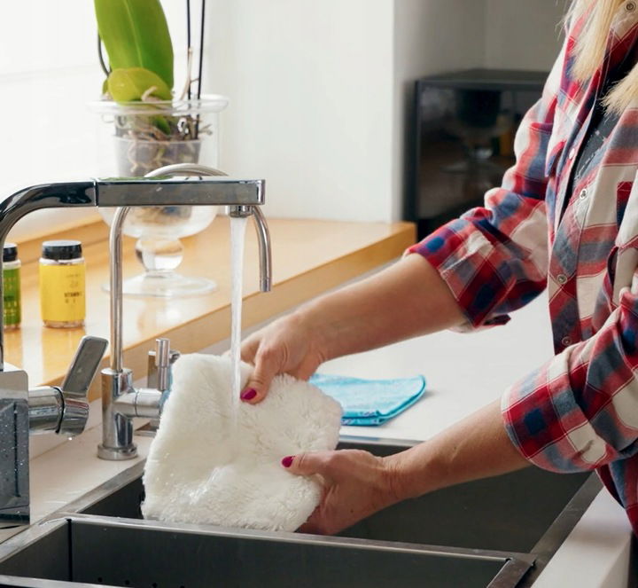 Przed pierwszym użyciem należy trzykrotnie wyprać rękawicę w pralce (krótki program, koniecznie 60°C, max 800 obrotów/min), aby wypłukać pozostałości włókien i przygotować je do pracy. Nie używamy płynów zmiękczających ani płynów do płukania. Unikamy suszenia w suszarce, na grzejnikach i w pełnym słońcu.