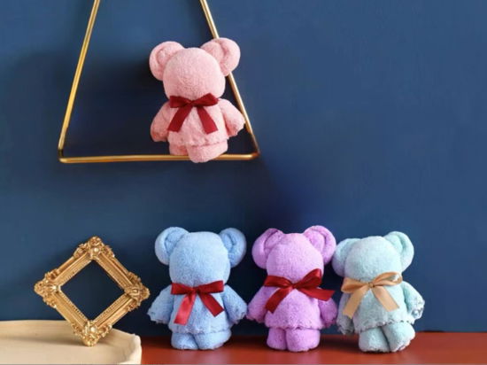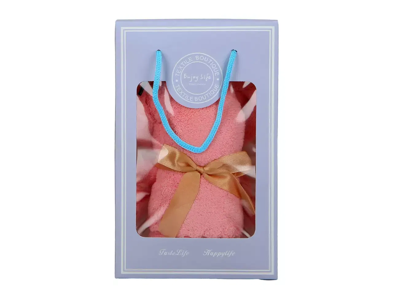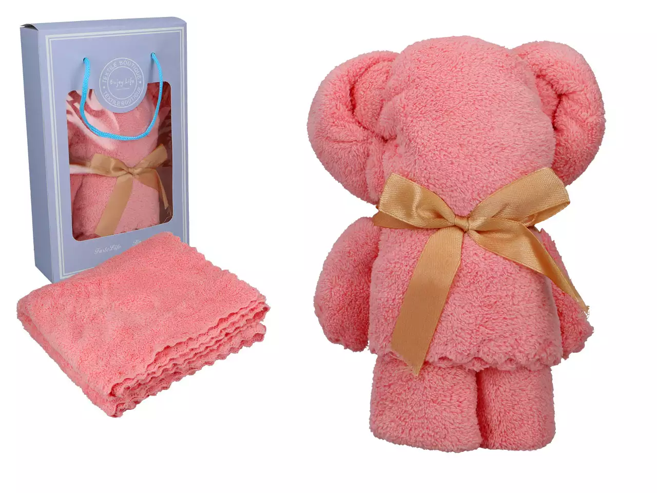 Różowy ręcznik uformowany na kształt misia ze wstążką. W opakowaniu prezentowym. Piękny, uroczy i praktyczny prezent np. z okazji urodzenia dziecka bądź na chrzest.