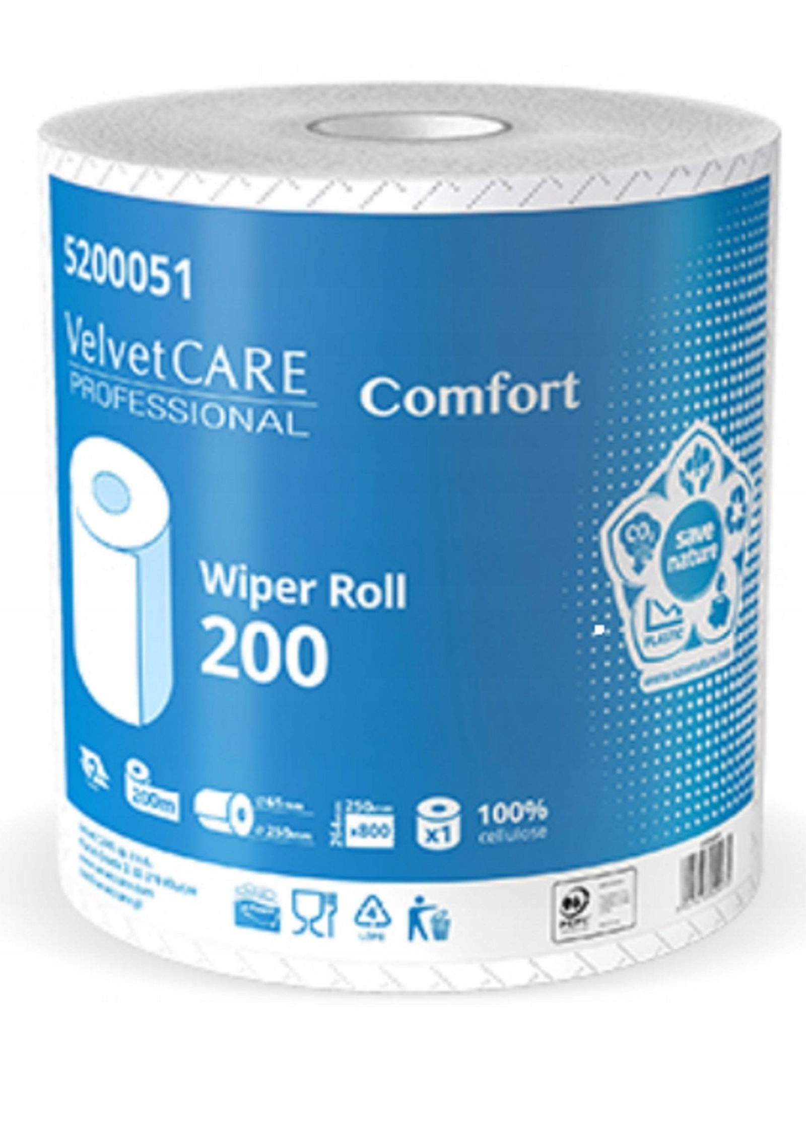 Czyściwo Velvet Care Professional Comfort o symbolu 5220109, wykonane jest w 100% z dwuwarstwowej, wysokiej jakości klejonej, grubej i wytrzymałej celulozy. Dzięki temu czyściwo doskonale wchłania wodę i inne substancje płynne.
