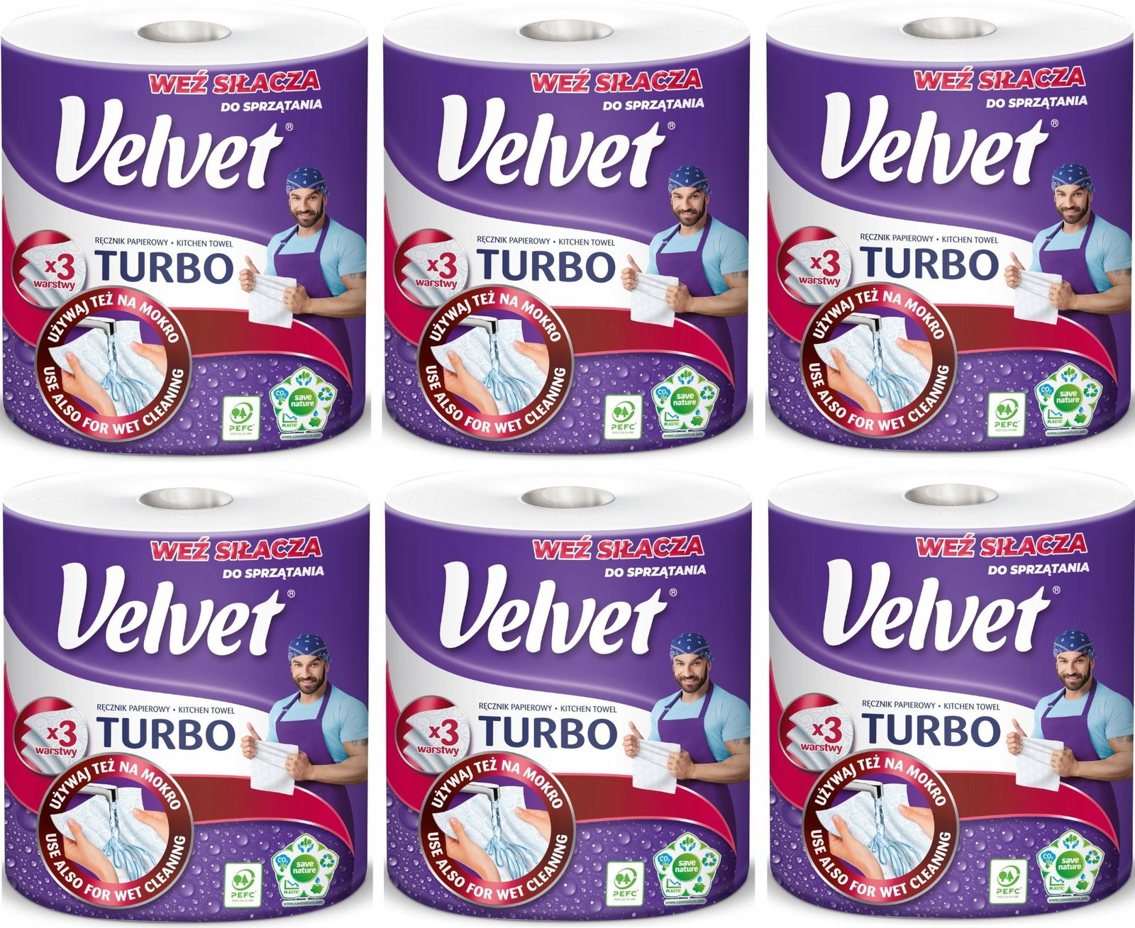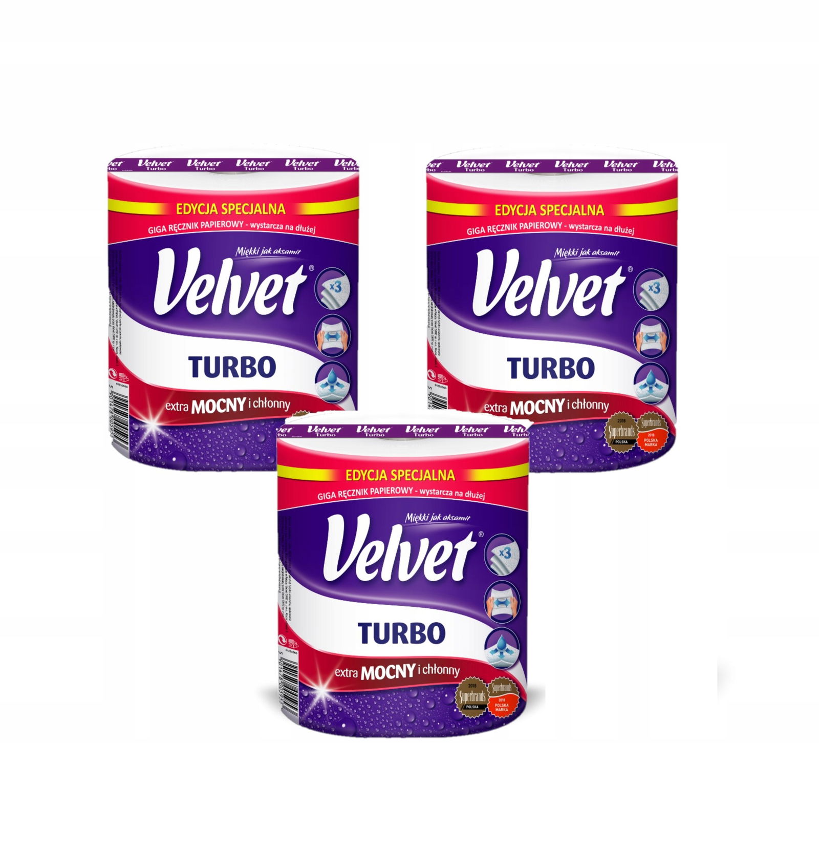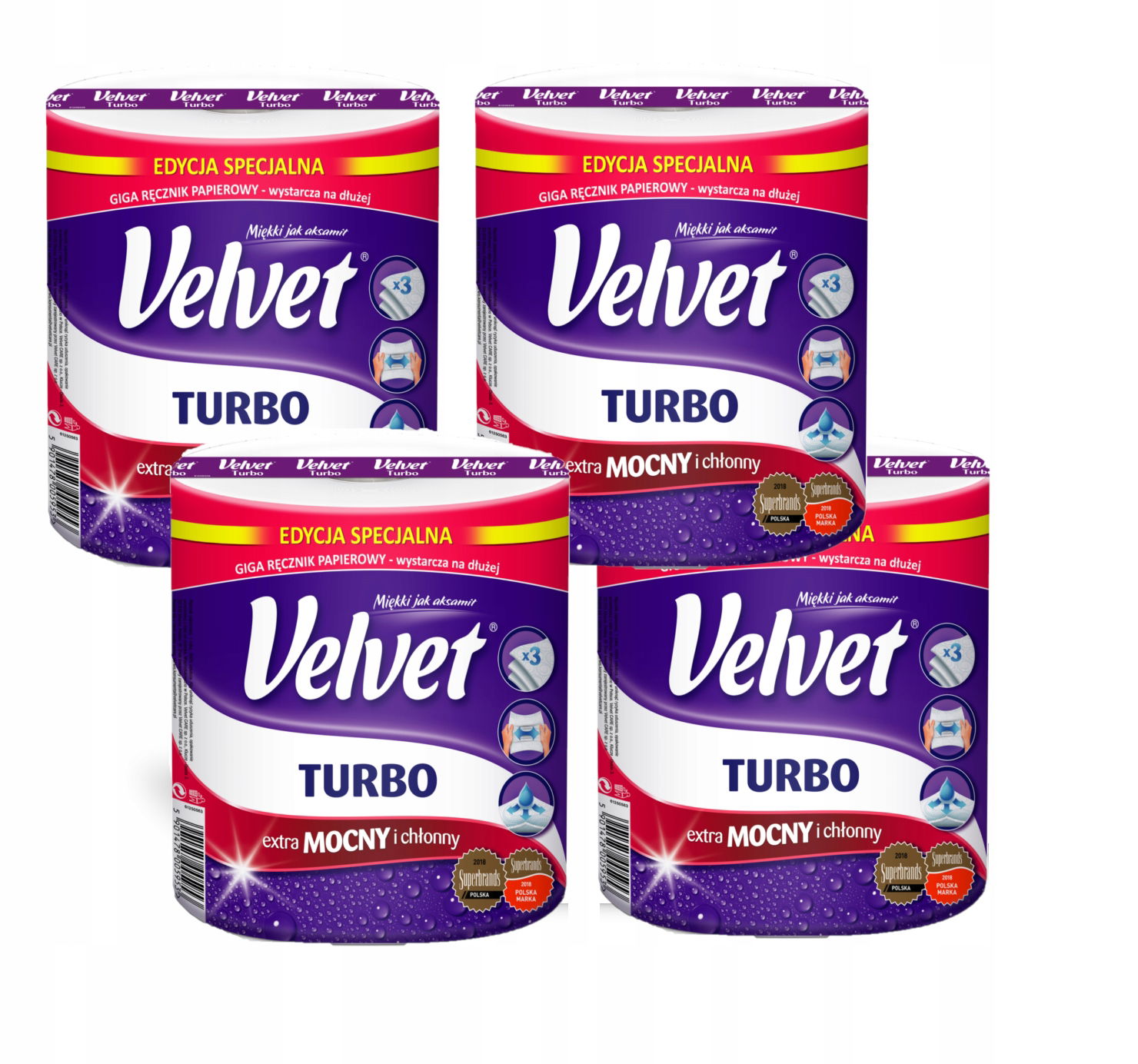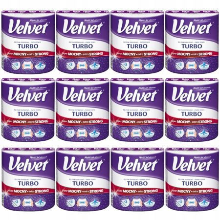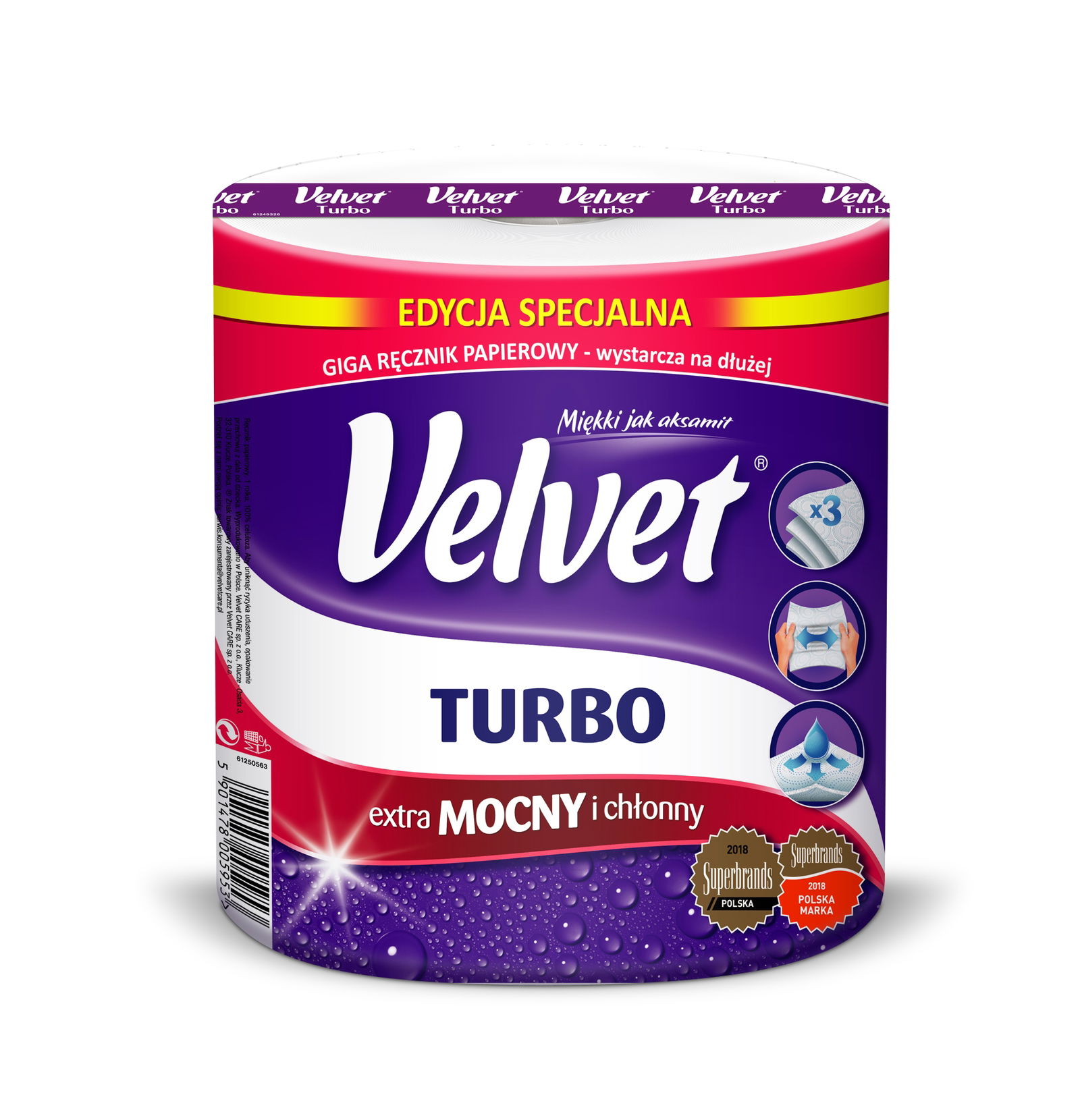 Giga rolka Velvet TURBO. Wyjątkowo skuteczny ręcznik papierowy. Z jego pomocą szybko i skutecznie posprzątasz każde pomieszczenie w Twoim domu. Grube, a przy tym odpowiednio miękkie 3 warstwy białej bibułki doskonale chłoną wilgoć. Dzięki specjalnej technologii produkcji jest tak wytrzymały, że może być też używany na mokro.
