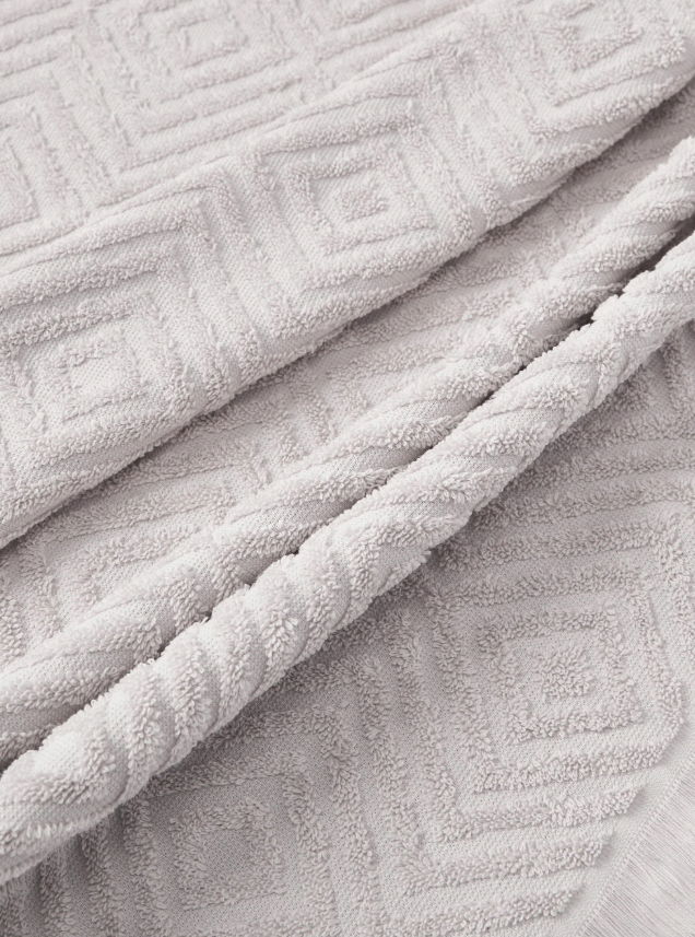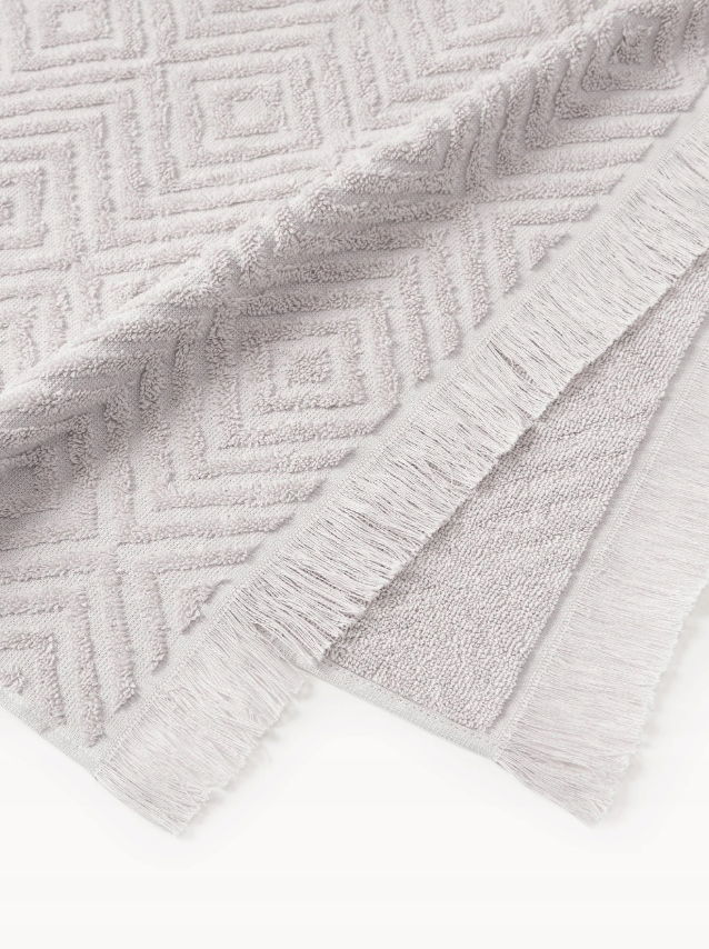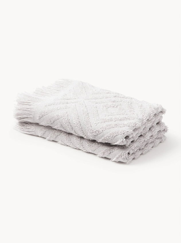 Dwa ręczniki dla gości z frędzlami i wypukłą strukturą. Ręczniki posiadają pętelkę do zawieszenia i zostały wyprodukowane w Portugalii.