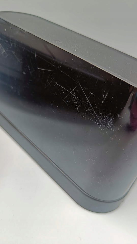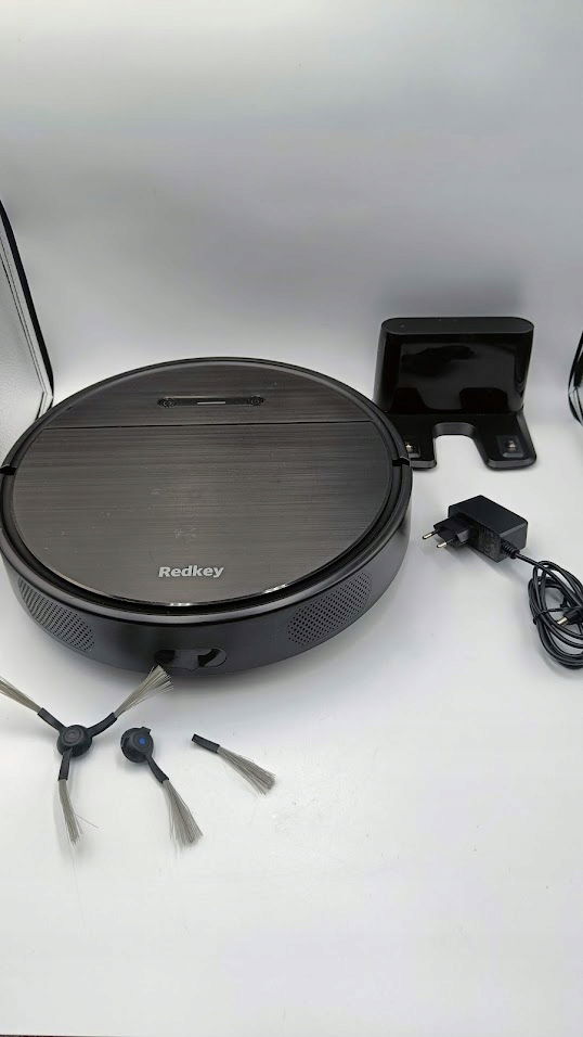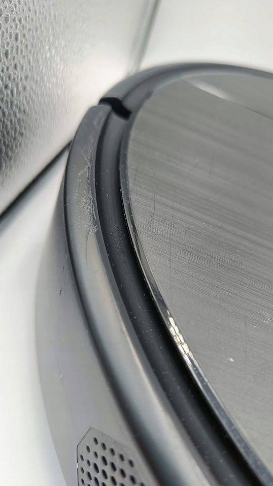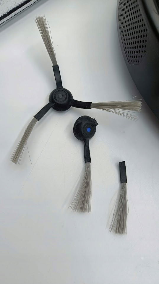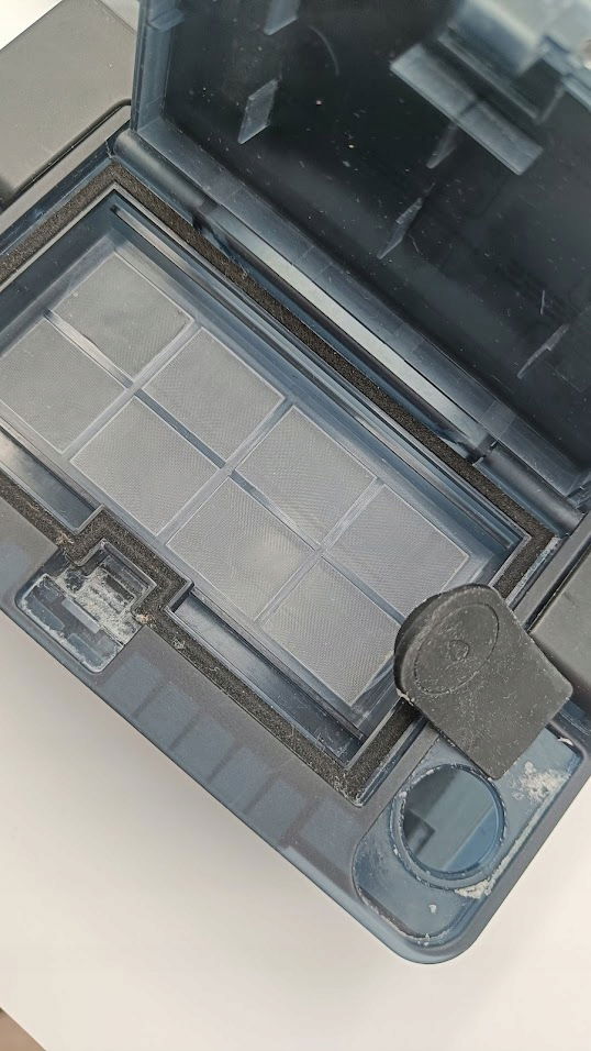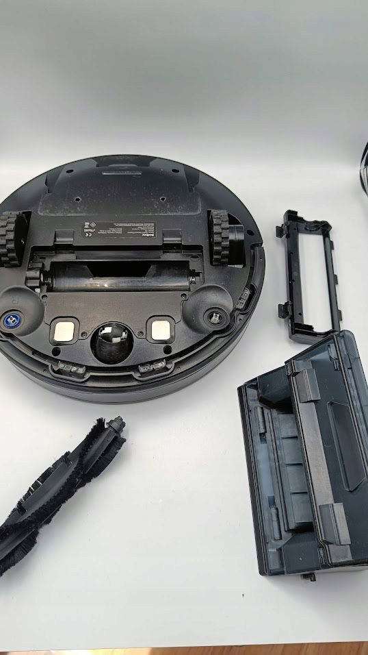 posiada ślady użytkowania - na stacji ładującej zadrapania, odpryski, urwana końcówka jednej ze szczotek, zabrudzony, rozerwanie na siatce podtrzymującej filtry