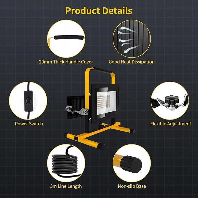 Lampa robocza LED ma wbudowane 120 diod LED o jasności 8000 lm, a przenośna lampa zewnętrzna LED o mocy 100 W wykorzystuje 2835 wysokowydajnych koralików LED, aby zapewnić najlepsze światło do użytku. Przełącznik na kablu umożliwia łatwe włączanie i wyłączanie lamp budowlanych. Nie musisz już odłączać zasilania.