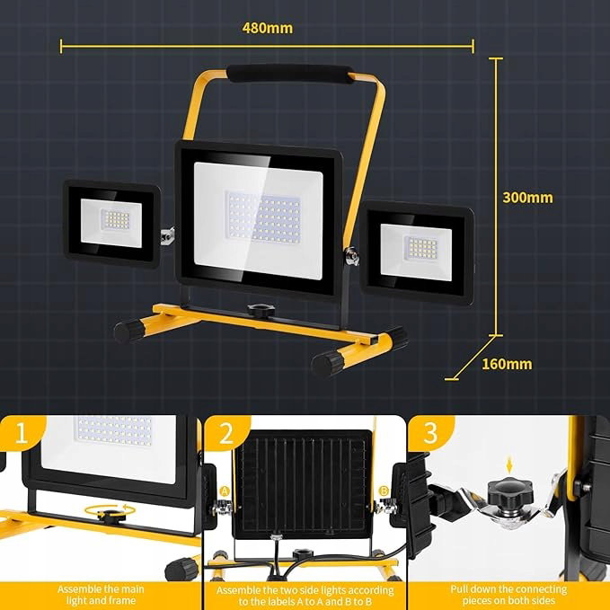 Dzięki mocnemu wspornikowi i uchwytowi możesz przymocować, zawiesić lub umieścić lampę budowlaną LED na ziemi, co ułatwi Twoją pracę. Obrotową podstawę można obrócić o 180° w pionie, a światła po obu stronach można regulować w przód i w tył, co pozwala oświetlić cały obszar i osiągnąć maksymalny zasięg oświetlenia.