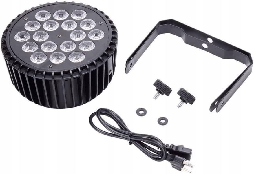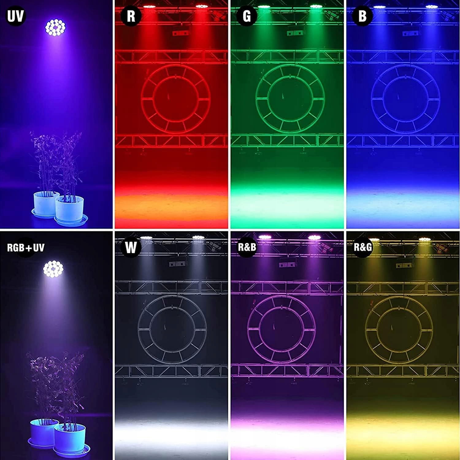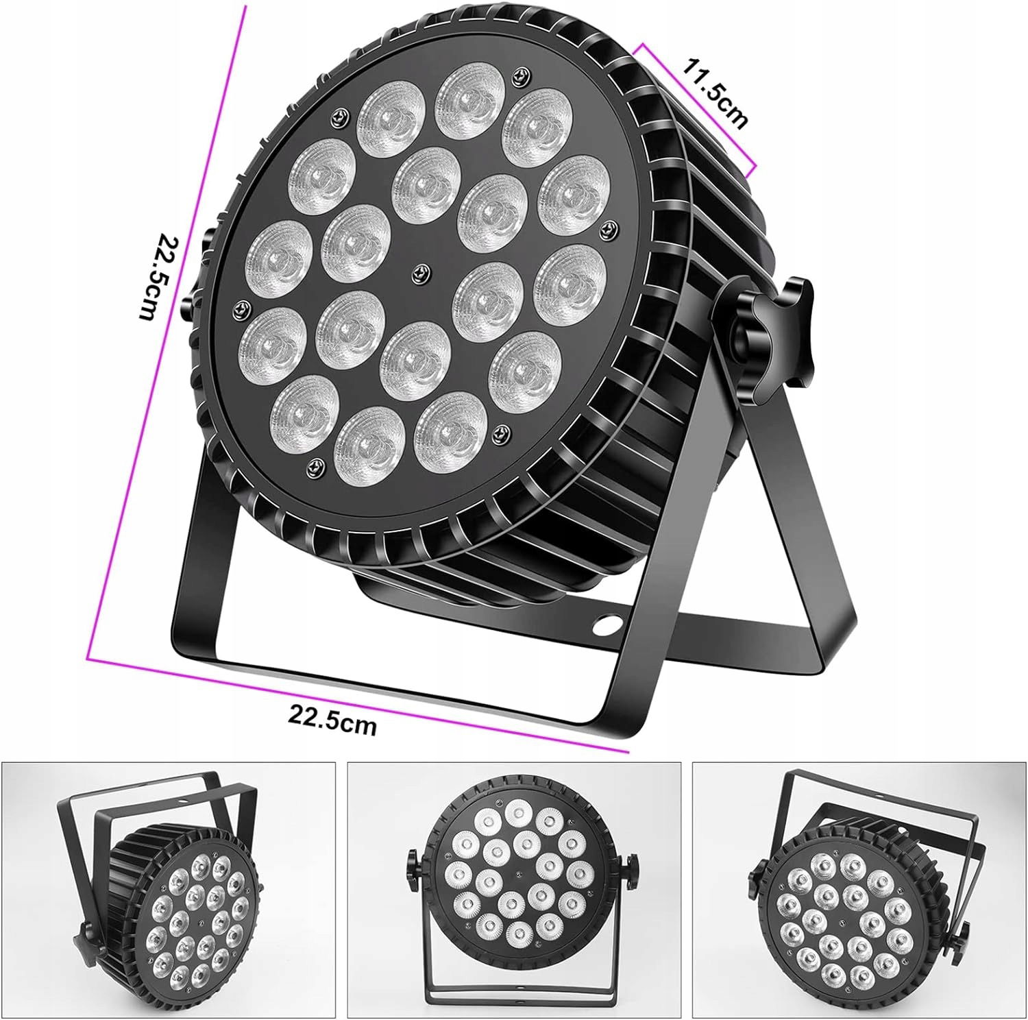 - Mocne oświetlenie sceniczne UV: oświetlenie sceniczne o mocy 18*10 W dostarczane z 18 diodami LED RGBW+UV, w tym 10 czerwonych, 10 zielonych i 10 niebieskich. Łącznie 18 diod LED - 10 W na każdą żarówkę LED UV o dużej jasności z łatwością oświetla duży salon lub garaż.