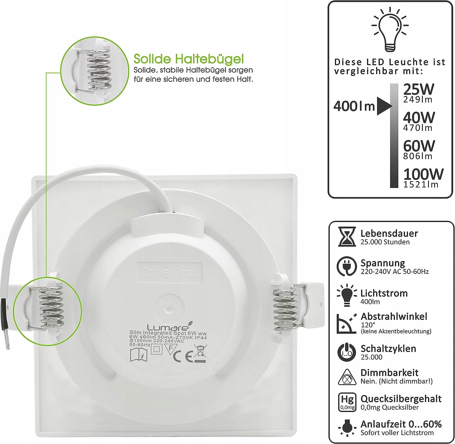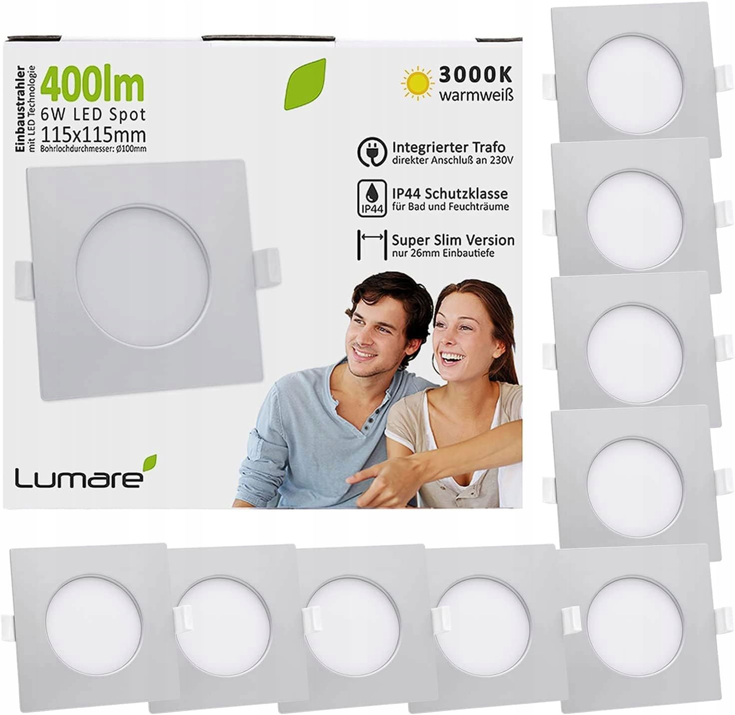 Lumare 9 x Reflektor wpuszczany LED 6 W IP44 Extra Flat 230 V Również do łazienek i pomieszczeń wilgotnych Srebrny Tylko 26 mm Głębokość montażu Wąski reflektor sufitowy kwadratowy z wbudowanymi 4 [klasa energetyczna F ]