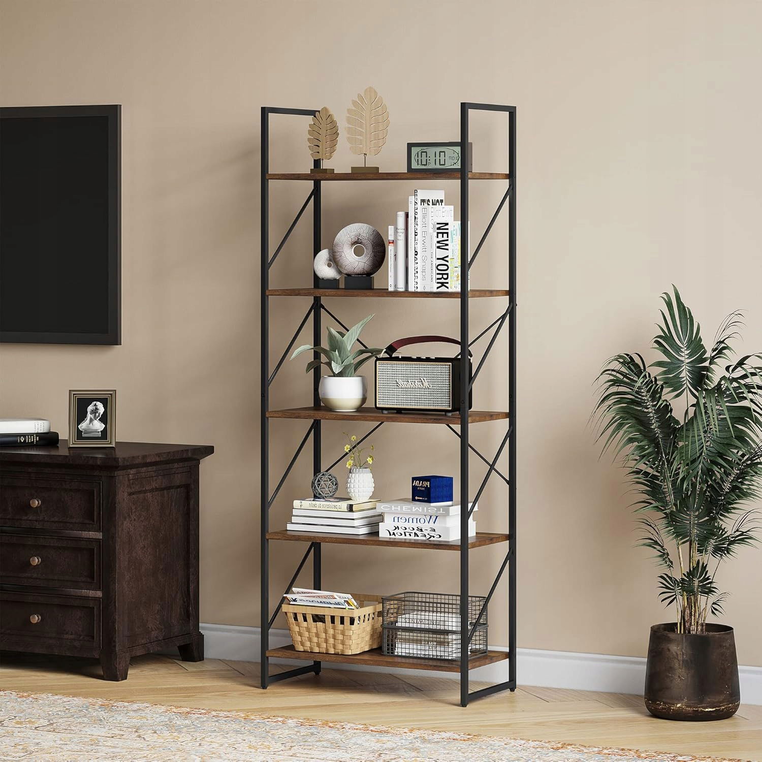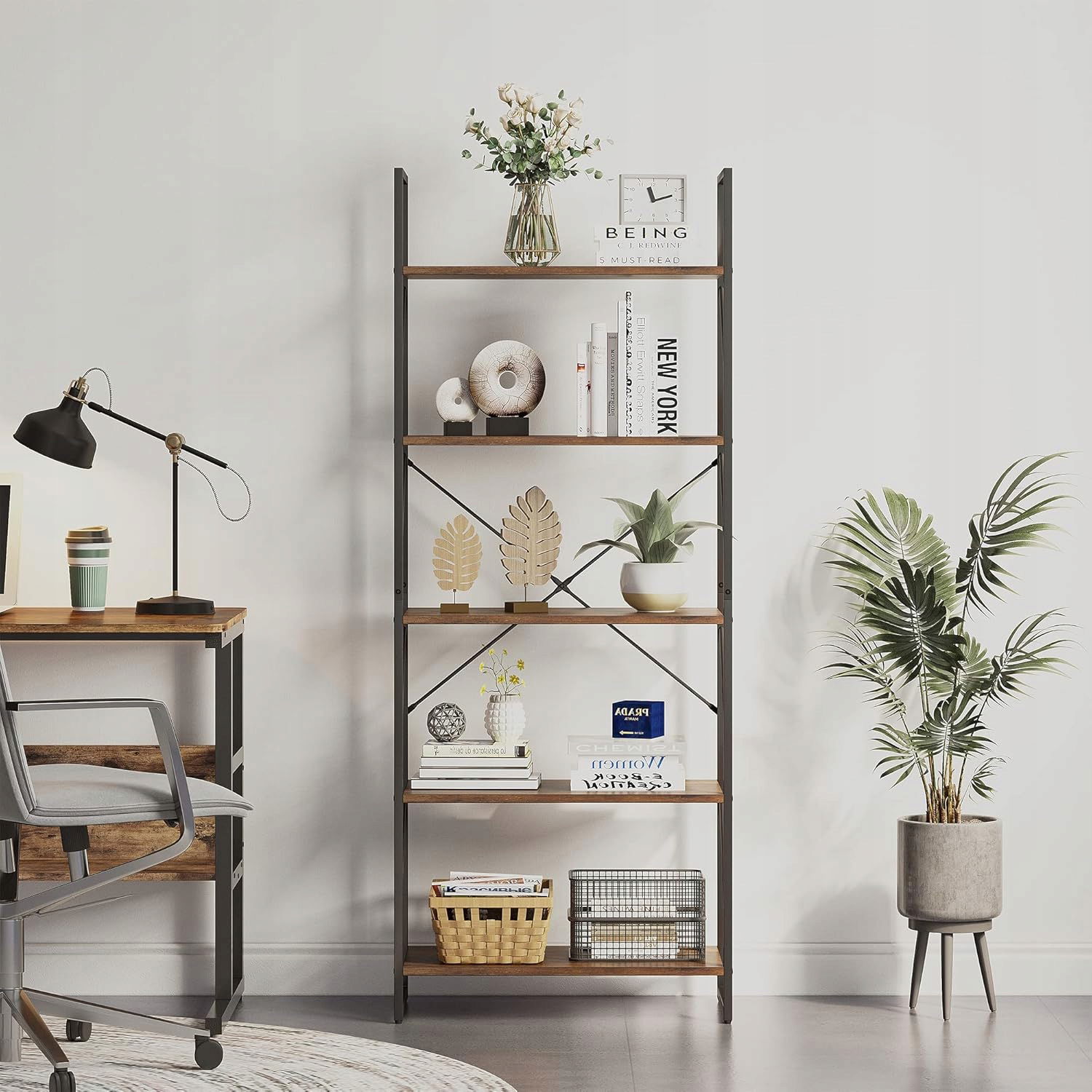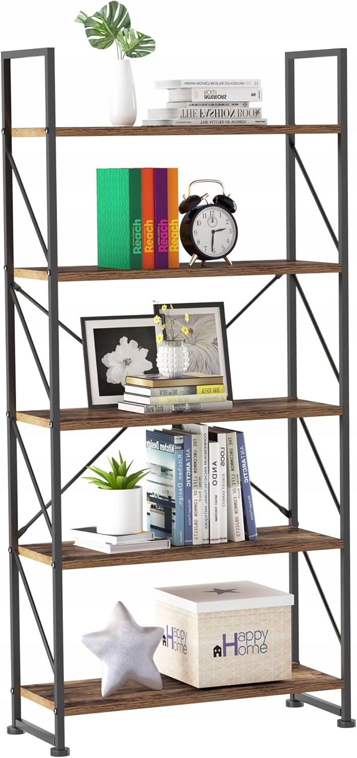 Nowoczesny regał industrialny z 5 otwartymi półkami to funkcjonalne i stylowe rozwiązanie do każdego wnętrza. Połączenie rustykalnego drewna i czarnej stalowej ramy nadaje mu elegancki, minimalistyczny charakter.